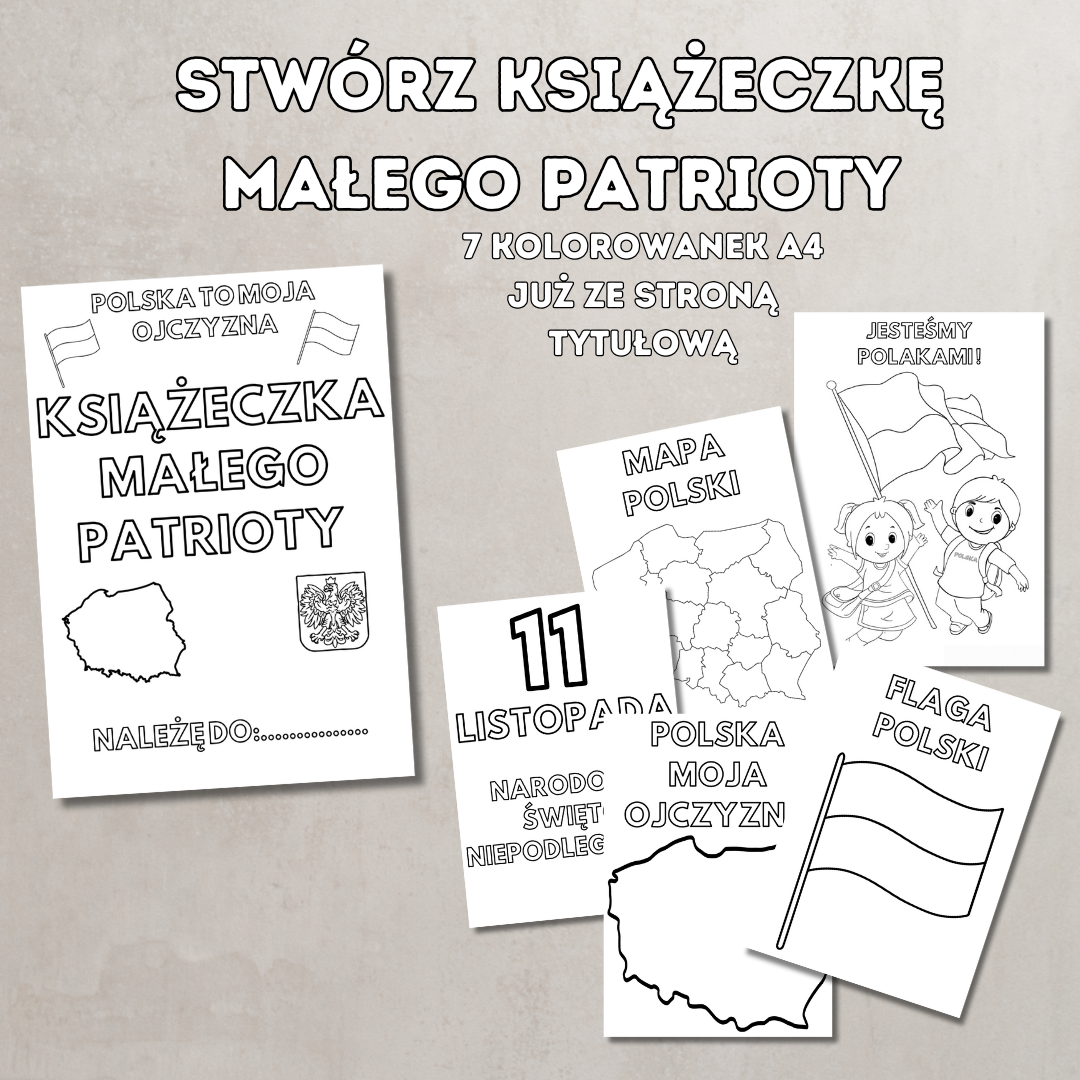 • Książeczka Małego Patrioty – 7 stron A4 do samodzielnego złożenia i pokolorowania. Dzieci poznają mapę Polski, flagę, godło oraz znaczenie 11 listopada.
