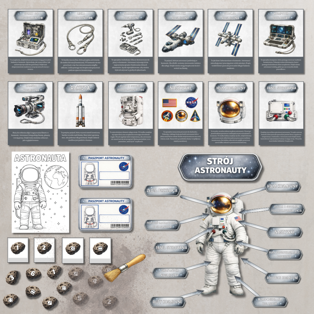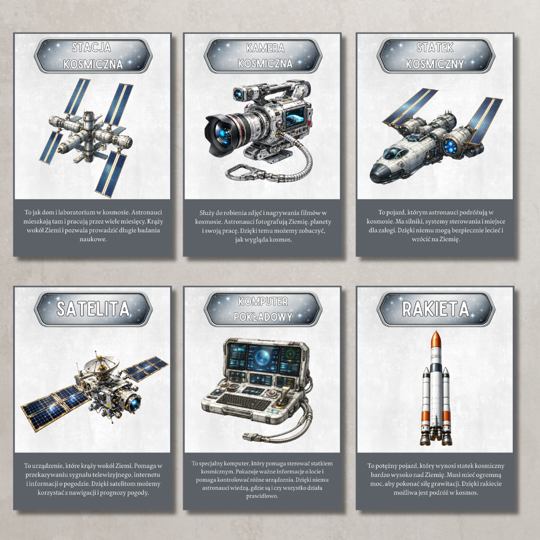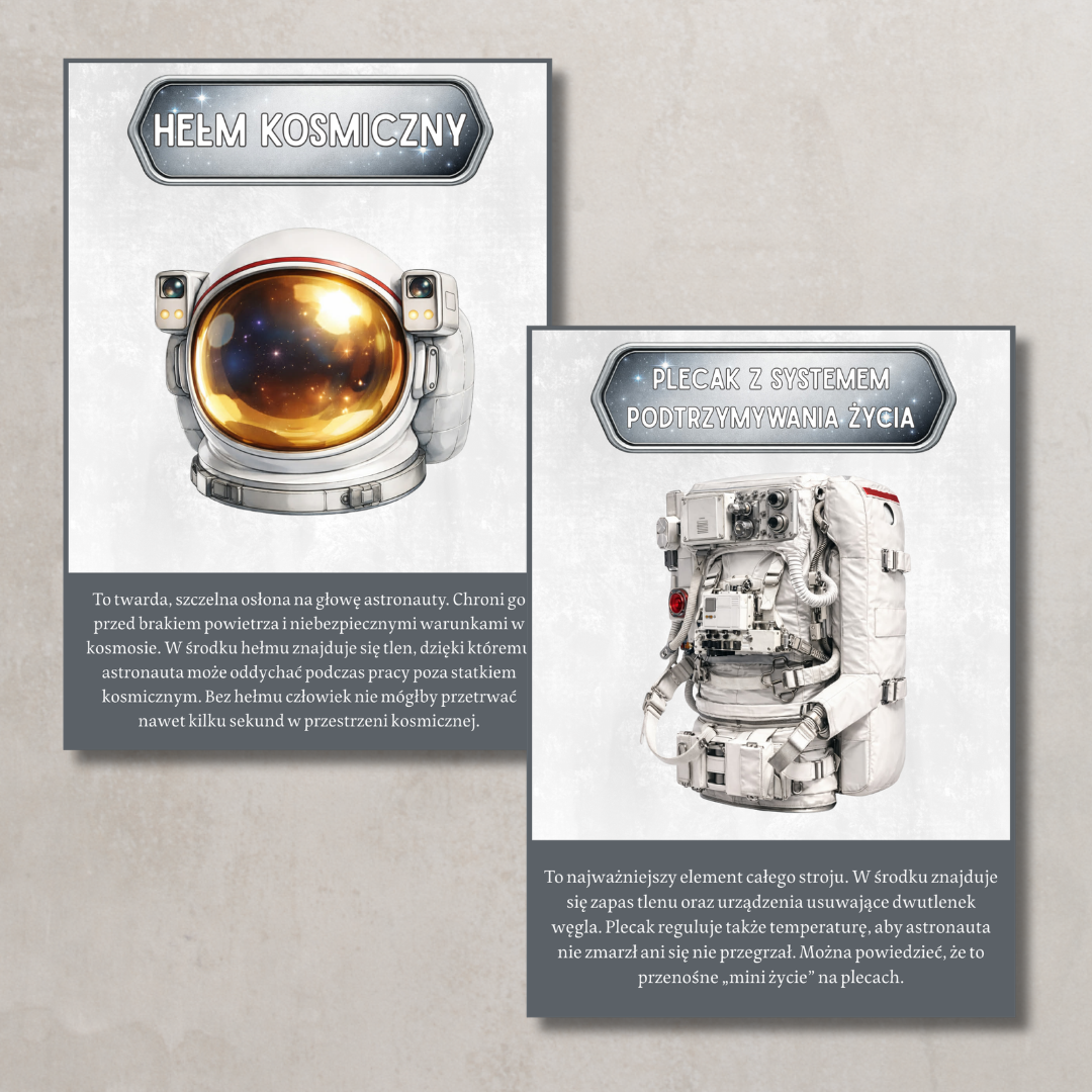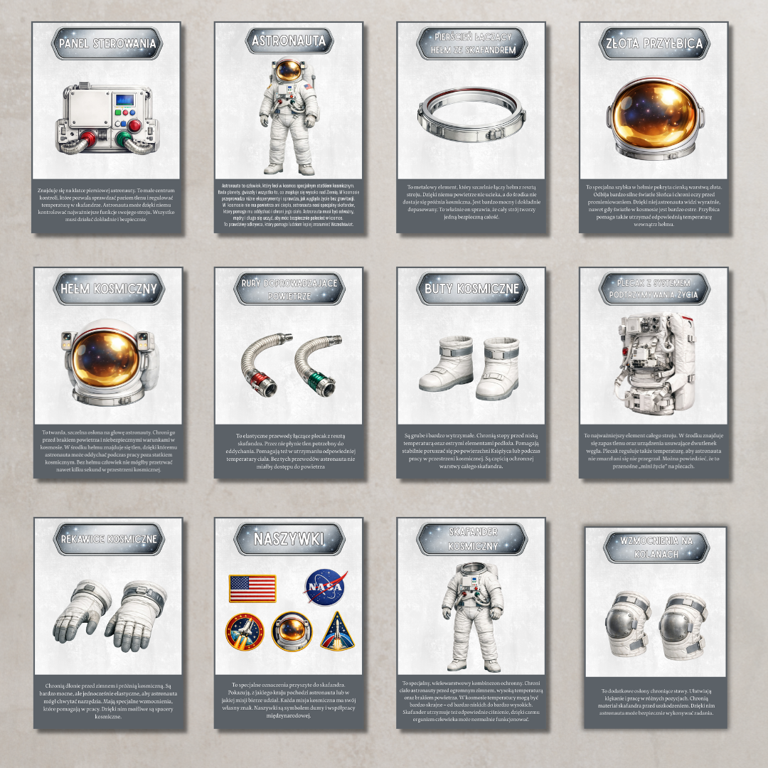 Karty edukacyjne „Astronauta i kosmos” Zestaw kart z kosmicznymi hasłami i ilustracjami (m.in. elementy wyposażenia astronauty oraz sprzęt wykorzystywany w kosmosie). Każda karta zawiera krótki opis, który w prosty sposób tłumaczy dziecku znaczenie danego pojęcia. Idealne do rozmów, zajęć tematycznych i gazetki.