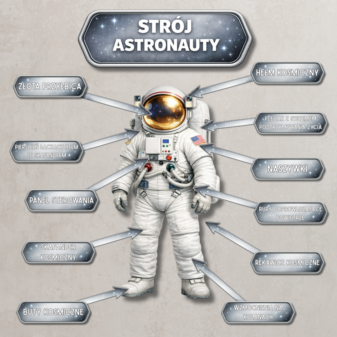Strój Astronauty – plansza XL Duża plansza edukacyjna z astronautą oraz podpisami elementów stroju. Ułatwia rozmowę o tym, jak wygląda prawdziwy strój astronauty i do czego służą jego części. Idealna do pracy przy tablicy i dekoracji sali.