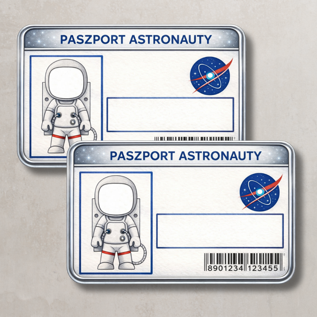Paszport Astronauty Karta identyfikacyjna do zabawy w kosmiczną misję. Dziecko może wpisać swoje dane, dodać zdjęcie lub rysunek i otrzymać własny numer misji. Świetna jako pamiątka z zajęć tematycznych lub element projektu „Kosmos”.