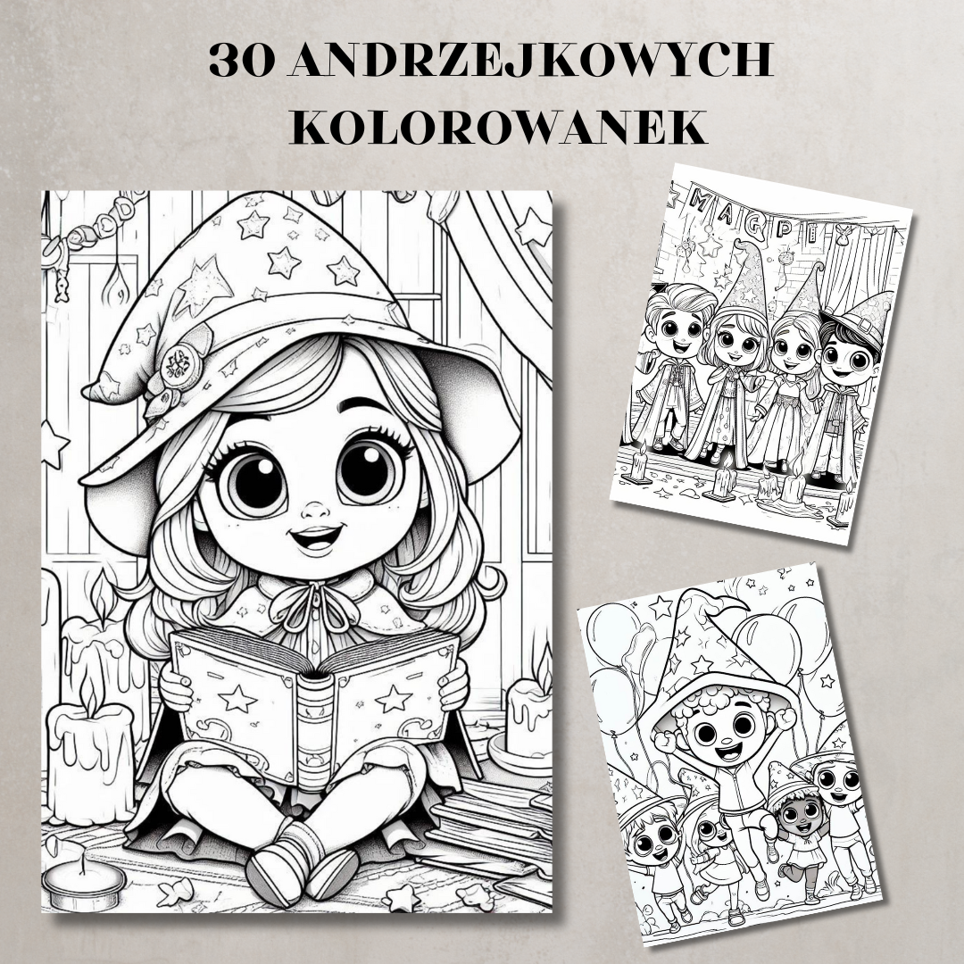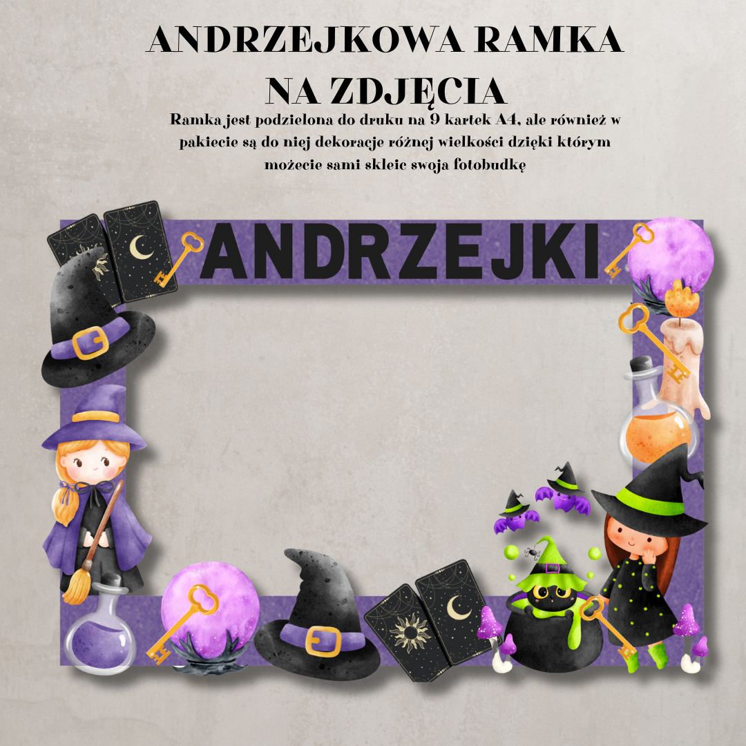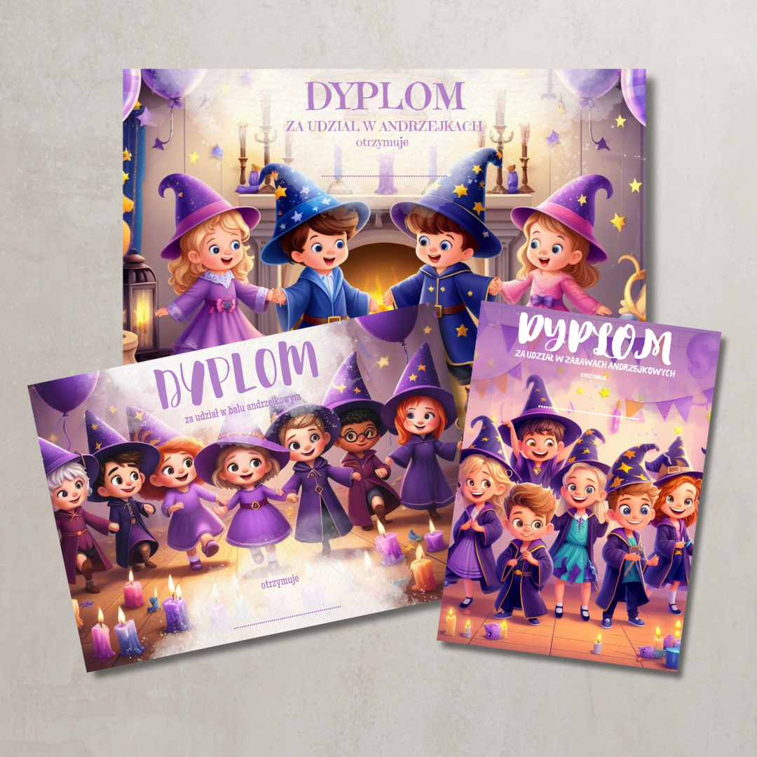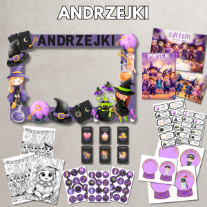 Kompletny zestaw materiałów do organizacji magicznej zabawy andrzejkowej w przedszkolu lub szkole. Zawiera gry, wróżby, dekoracje i aktywności, które wprowadzą dzieci w tajemniczy, czarodziejski nastrój.