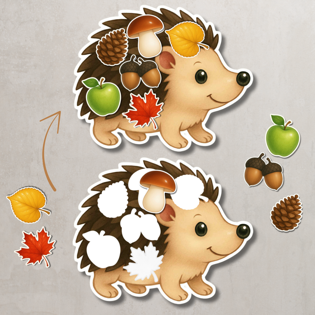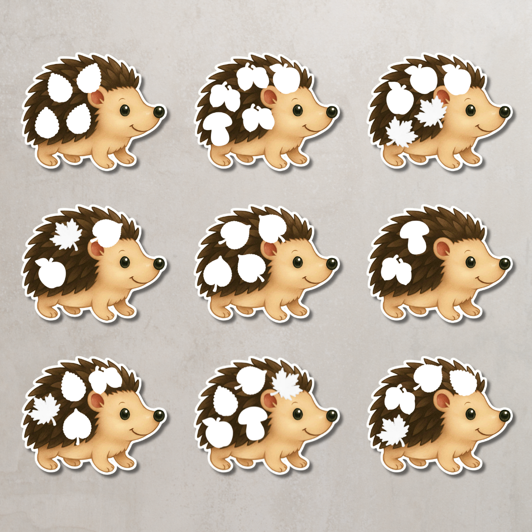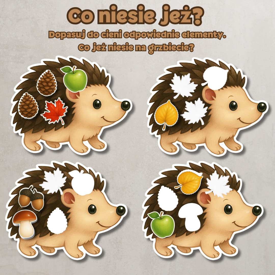 Każdy jeż ma osobne elementy do dopasowania, dzięki czemu zabawa jest angażująca i pełna jesiennego klimatu. Idealna pomoc dla przedszkolaków i młodszych uczniów do pracy indywidualnej, zajęć grupowych i zabaw tematycznych o jesieni.