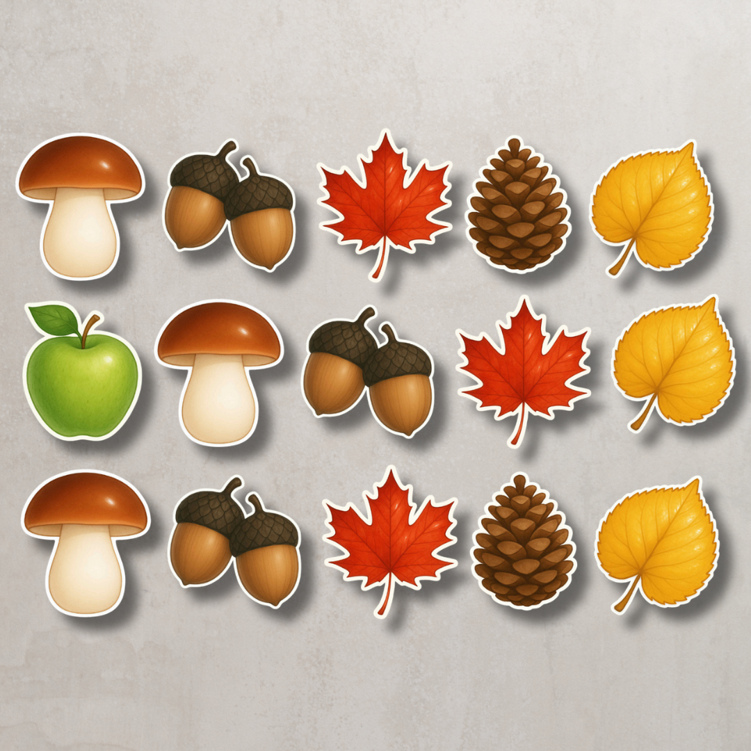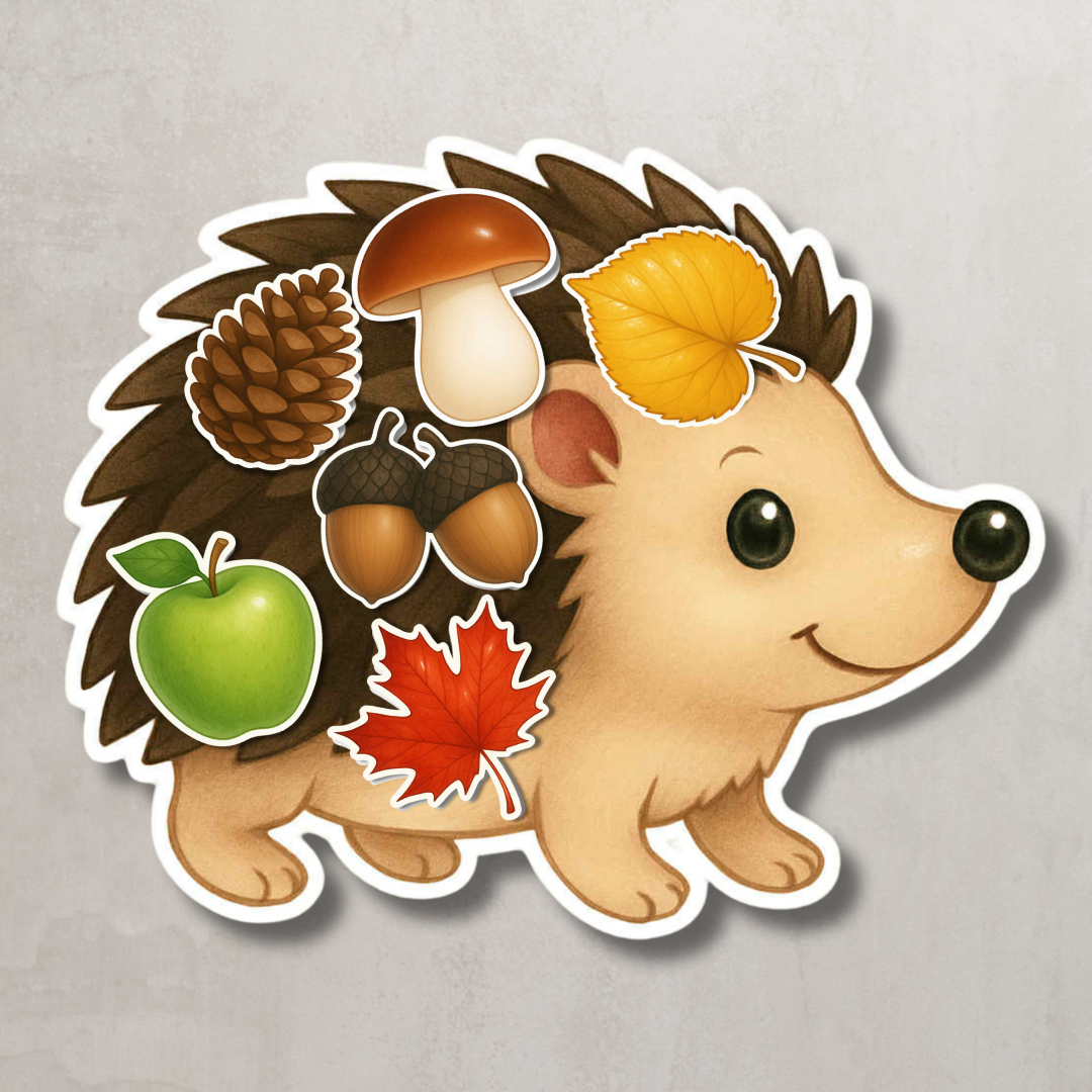 W zestawie znajdziesz kilka wersji jeżyków z różnymi układami przedmiotów: liście, grzybki, jabłka, szyszki czy żołędzie.