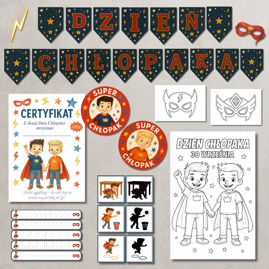 Pełen energii i zabawy zestaw do zorganizowania wyjątkowego Dnia Chłopaka w przedszkolu lub szkole. Motyw superbohatera sprawia, że każde dziecko może poczuć się wyjątkowo, a zajęcia nabierają niezwykłego charakteru!