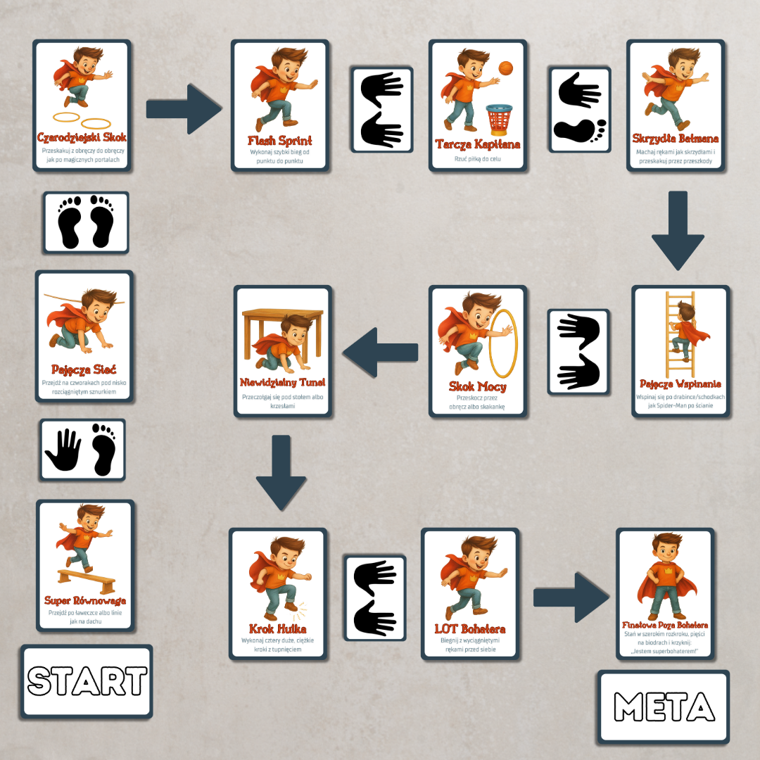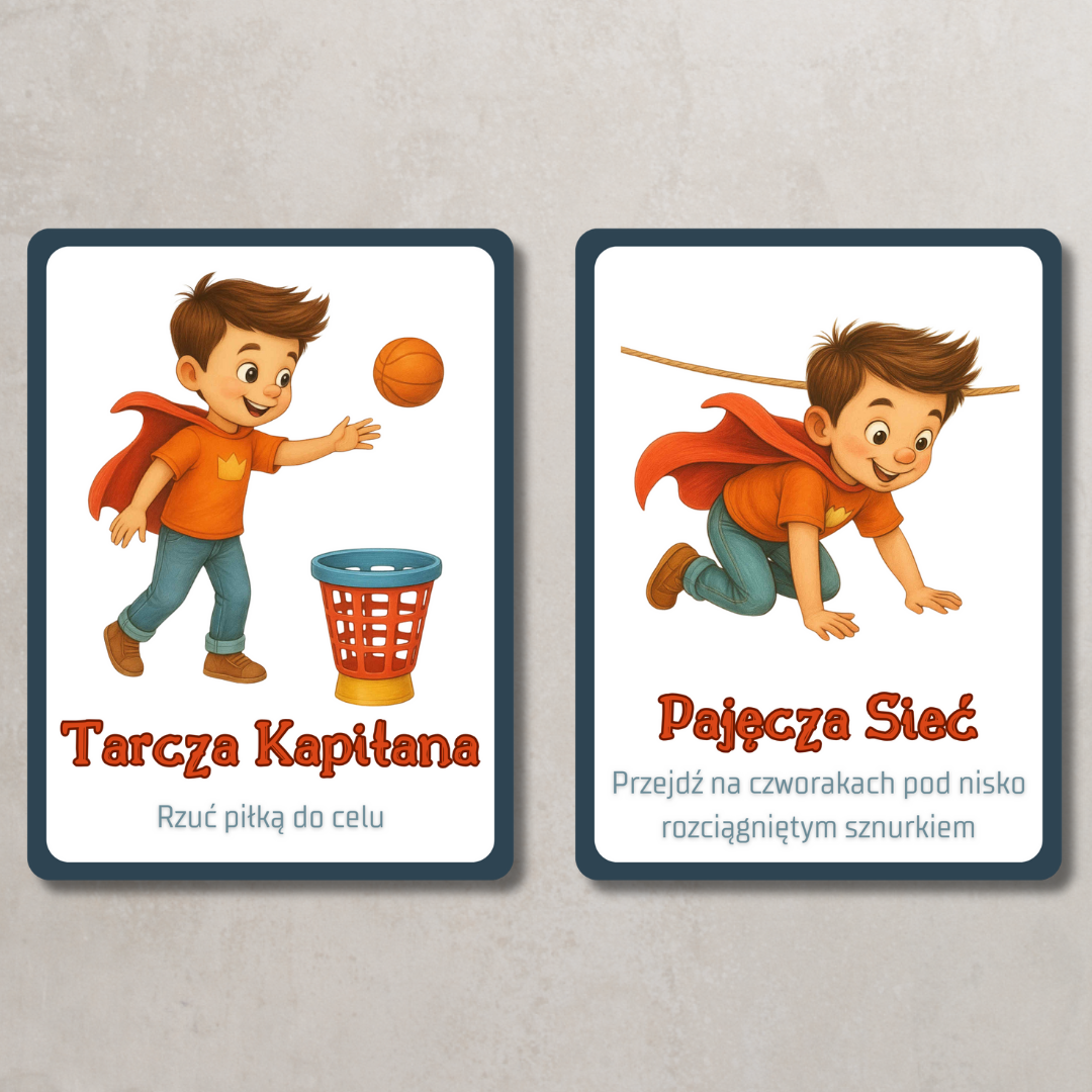 • Ścieżka gimnastyczna „Superbohater” – zestaw kart z ćwiczeniami ruchowymi inspirowanymi supermocami (np. „Pajęcza Sieć”, „Skok Iron Mana”, „Tarcza Kapitana”).