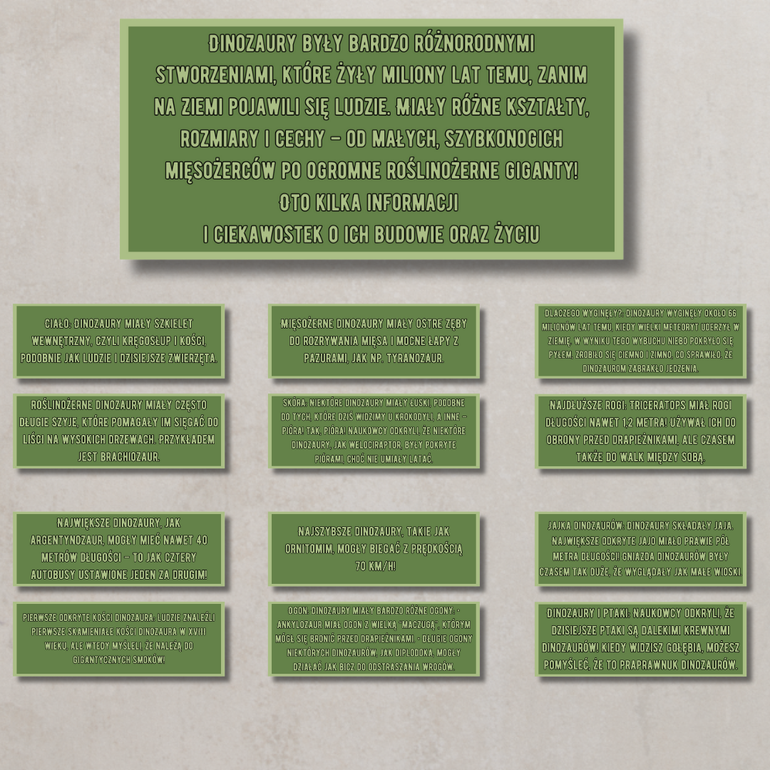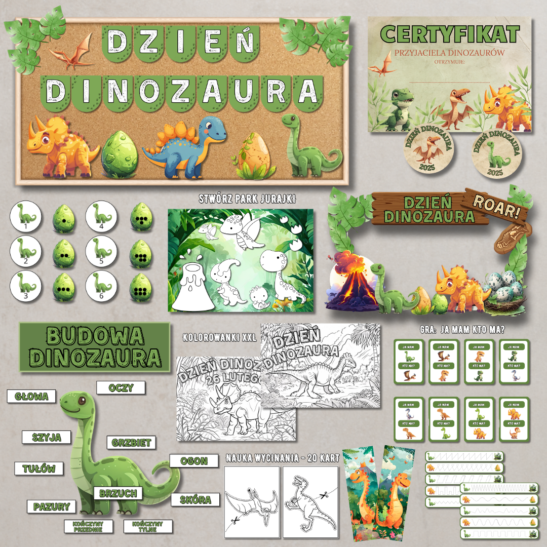 Kompletny zestaw materiałów dydaktycznych i dekoracyjnych przygotowany z myślą o obchodach Dnia Dinozaura. Idealny dla przedszkoli i klas wczesnoszkolnych — łączy naukę, zabawę i rozwijanie zainteresowań światem prehistorii.