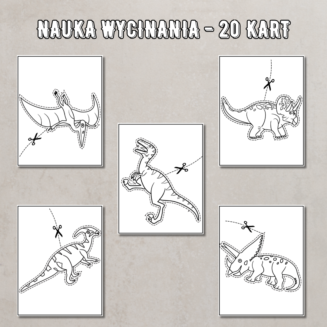 • Nauka wycinania – 20 kart z dinozaurami – ćwiczenie precyzji i koordynacji ręka–oko