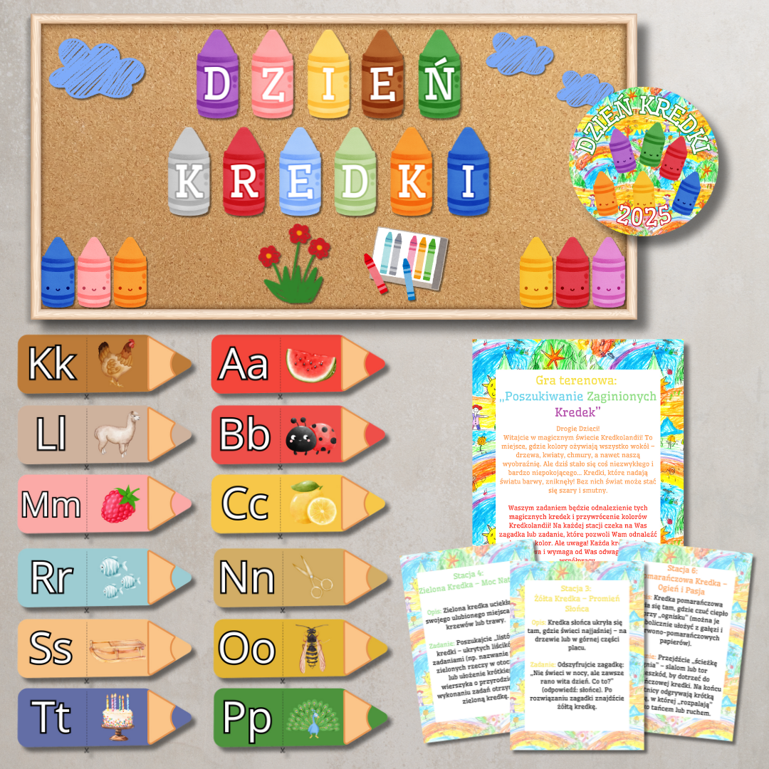 Pakiet „Dzień Kredki” to gotowe narzędzie do przeprowadzenia radosnych i rozwijających zajęć, które wprowadzą dzieci w świat kolorów, liter i wspólnej zabawy.