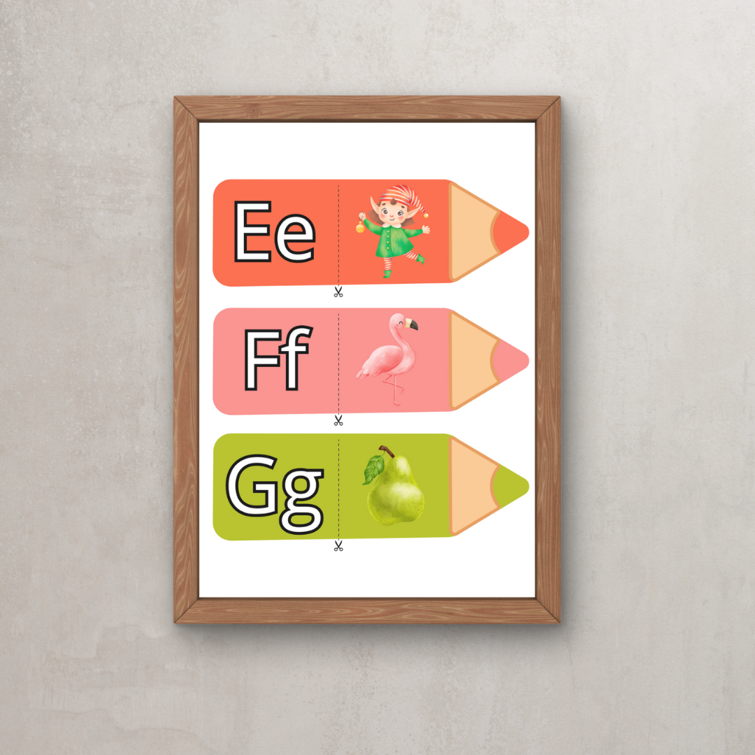 • Karty „Dopasuj literkę do obrazka” – ćwiczenie wspierające naukę liter i rozwijające spostrzegawczość.