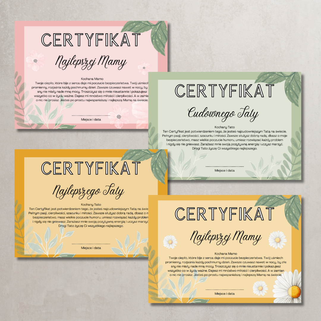 • Certyfikaty – cztery wzory dyplomów z dedykacjami: