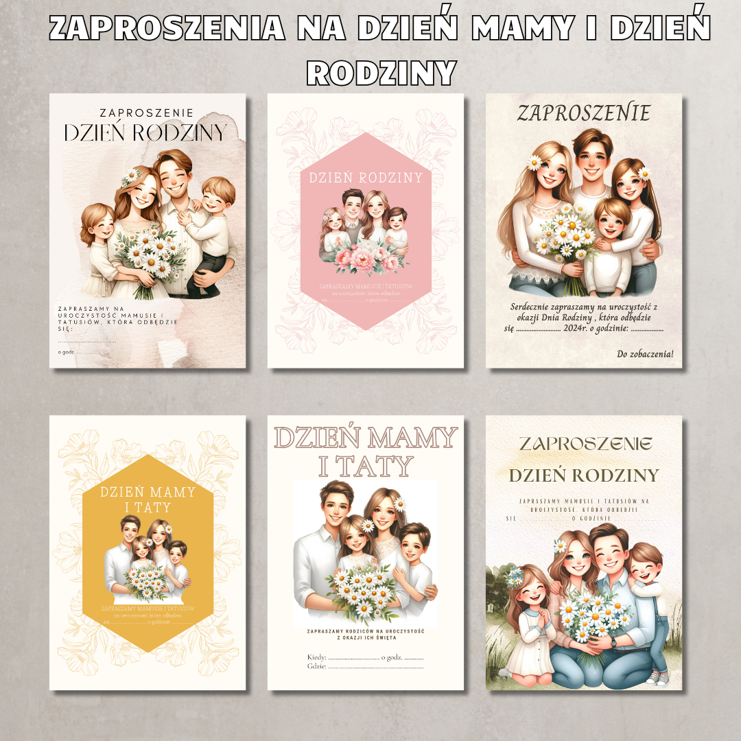 • Zaproszenia – kilka gotowych wzorów zaproszeń na uroczystość Dnia Mamy i Taty lub Dnia Rodziny, w wersjach do samodzielnego uzupełnienia.