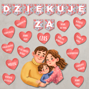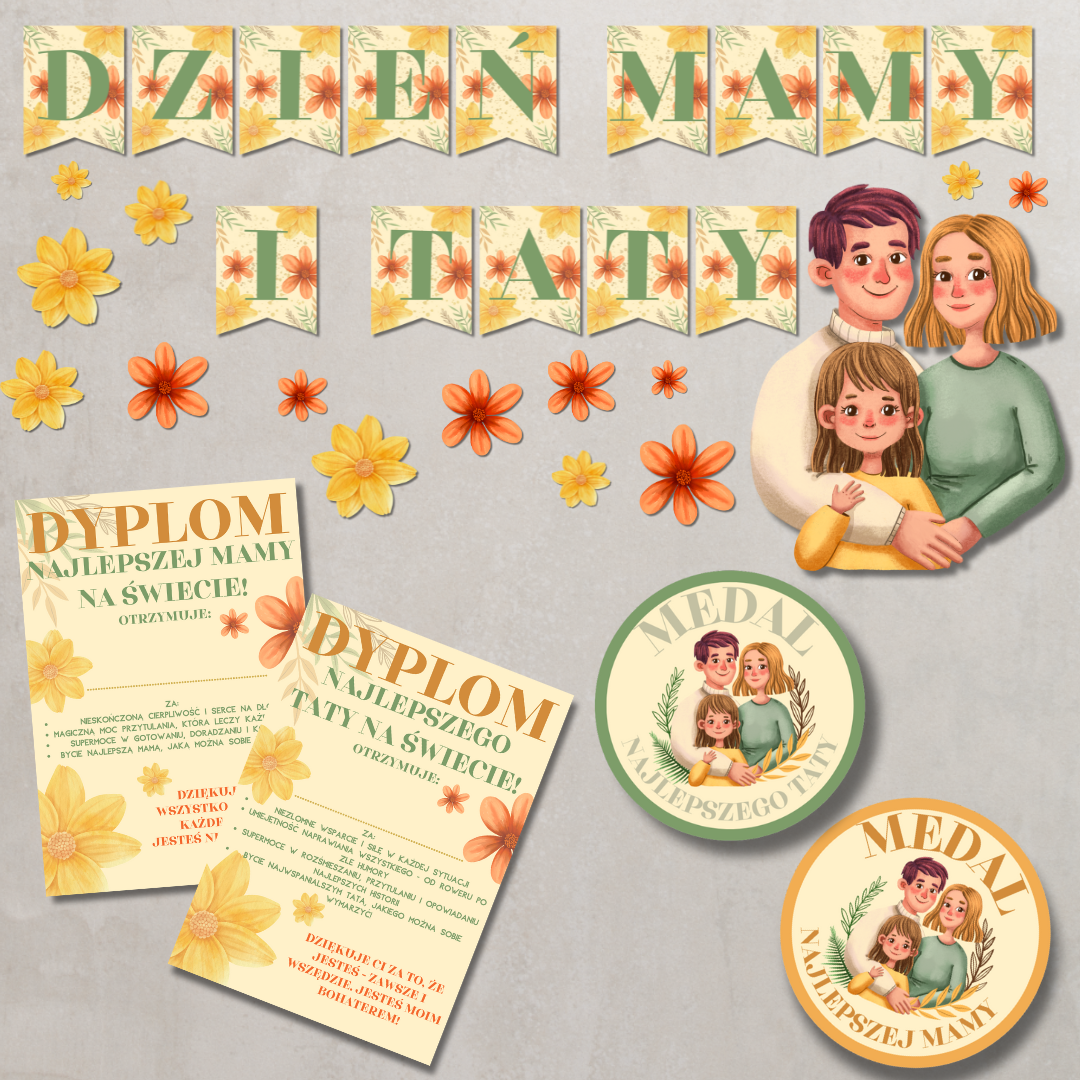 Pakiet „Dzień Mamy i Taty 2025” to gotowy zestaw, który pozwoli w prosty sposób przygotować piękną oprawę święta rodziców. Materiały można wykorzystać do wystroju sali, wykonania zdjęć pamiątkowych oraz wręczenia rodzicom wyjątkowych upominków przygotowanych przez dzieci. Całość utrzymana jest w ciepłej, rodzinnej kolorystyce, z ilustracjami przedstawiającymi bliskość i miłość rodzinną.
