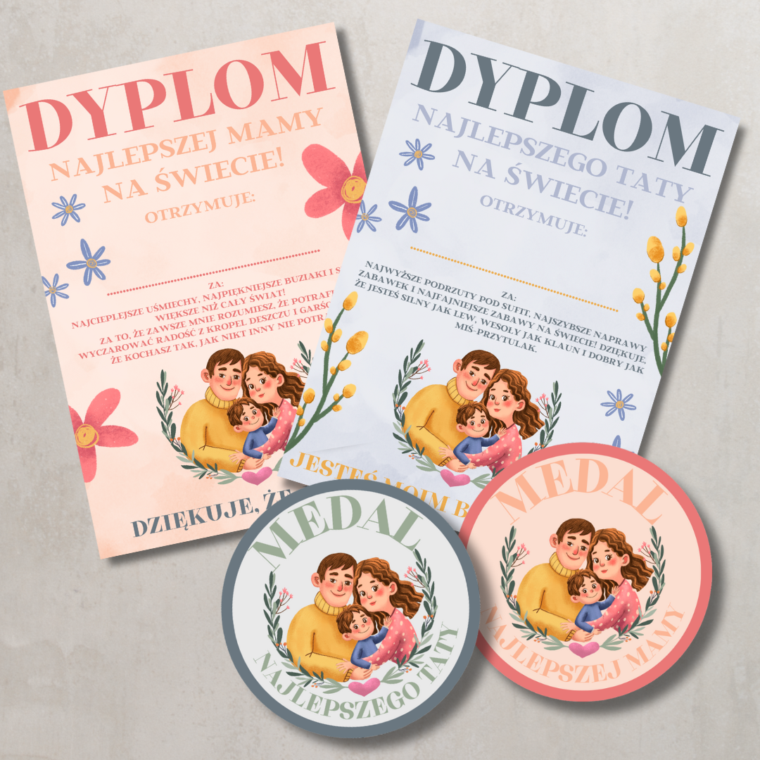 • Dyplomy dla Mamy i Taty (2 wersje) – eleganckie, kolorowe dyplomy z miejscem na wpisanie imienia dziecka. Każdy z nich zawiera ciepłe słowa wdzięczności i podziękowania.