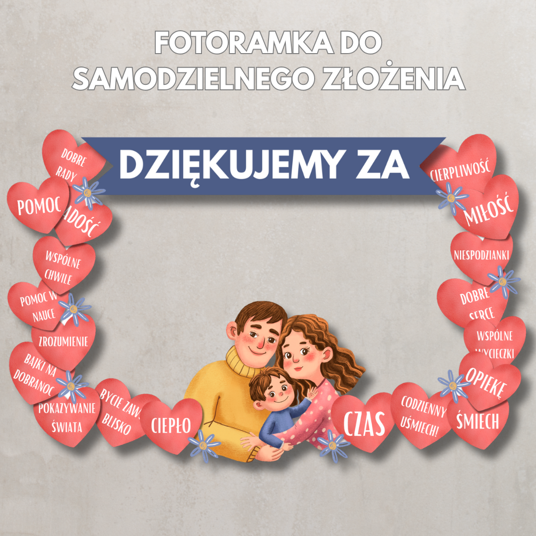 • Dekoracje XXL (2 części) – duże, drukowane elementy do stworzenia tła, tablicy lub fotokącika (m.in. kwiaty, serca, rodzice z dziećmi).