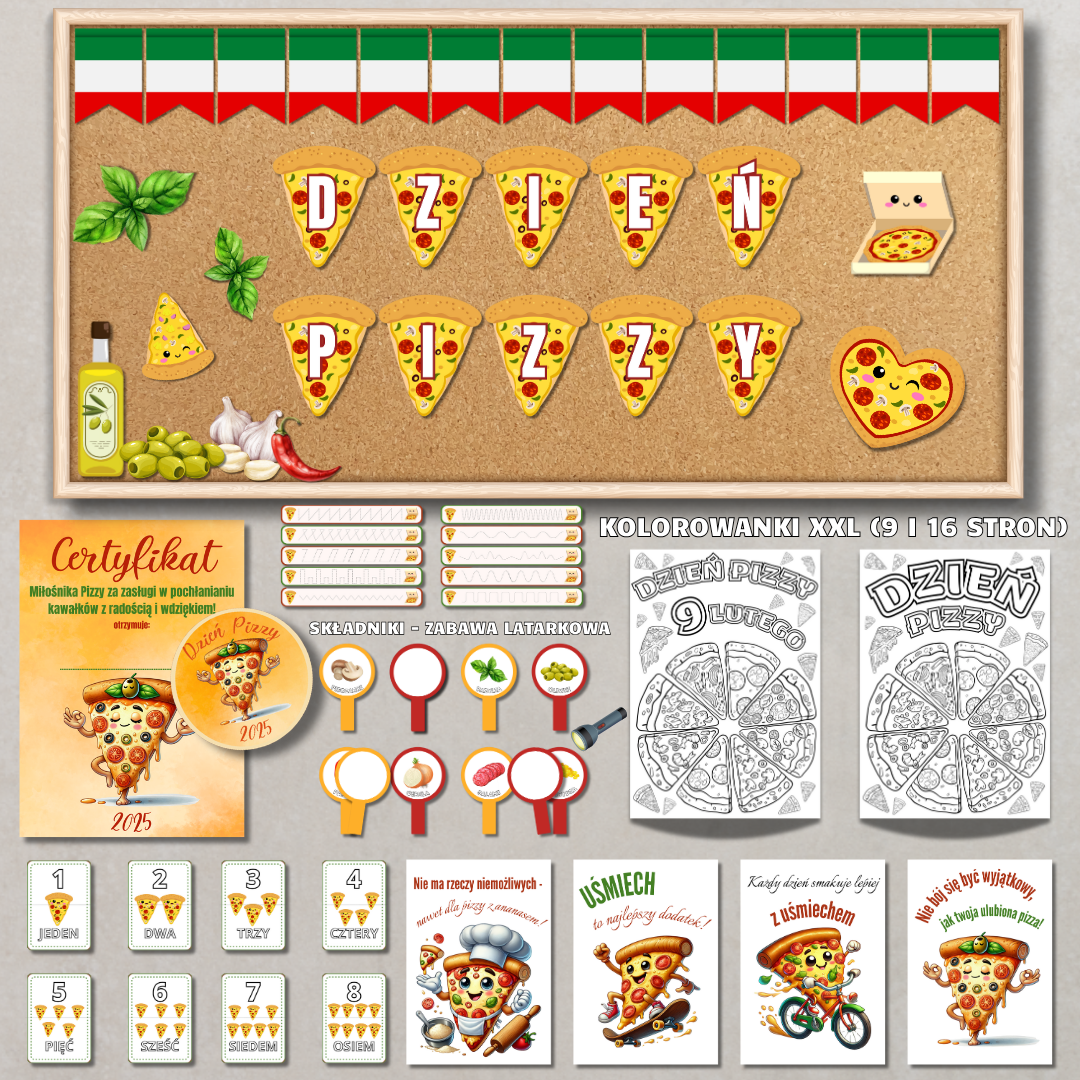 Świętuj najsmaczniejsze święto w roku Dzień Pizzy (9 lutego) – w wyjątkowy sposób! Nasz pakiet to kompletny zestaw materiałów dydaktycznych i dekoracyjnych, dzięki którym zorganizujesz radosny, pełen zabawy i nauki dzień w przedszkolu lub szkole.