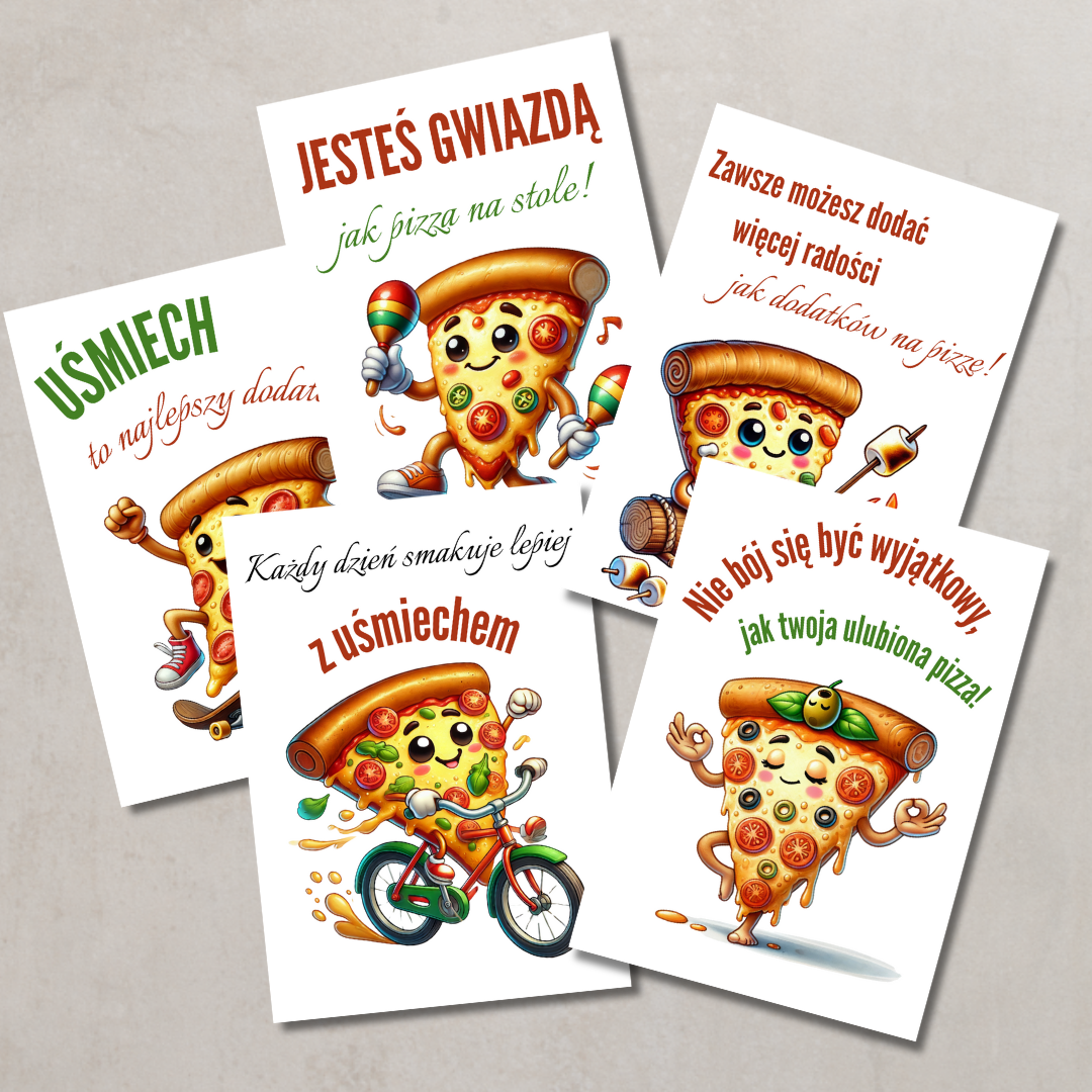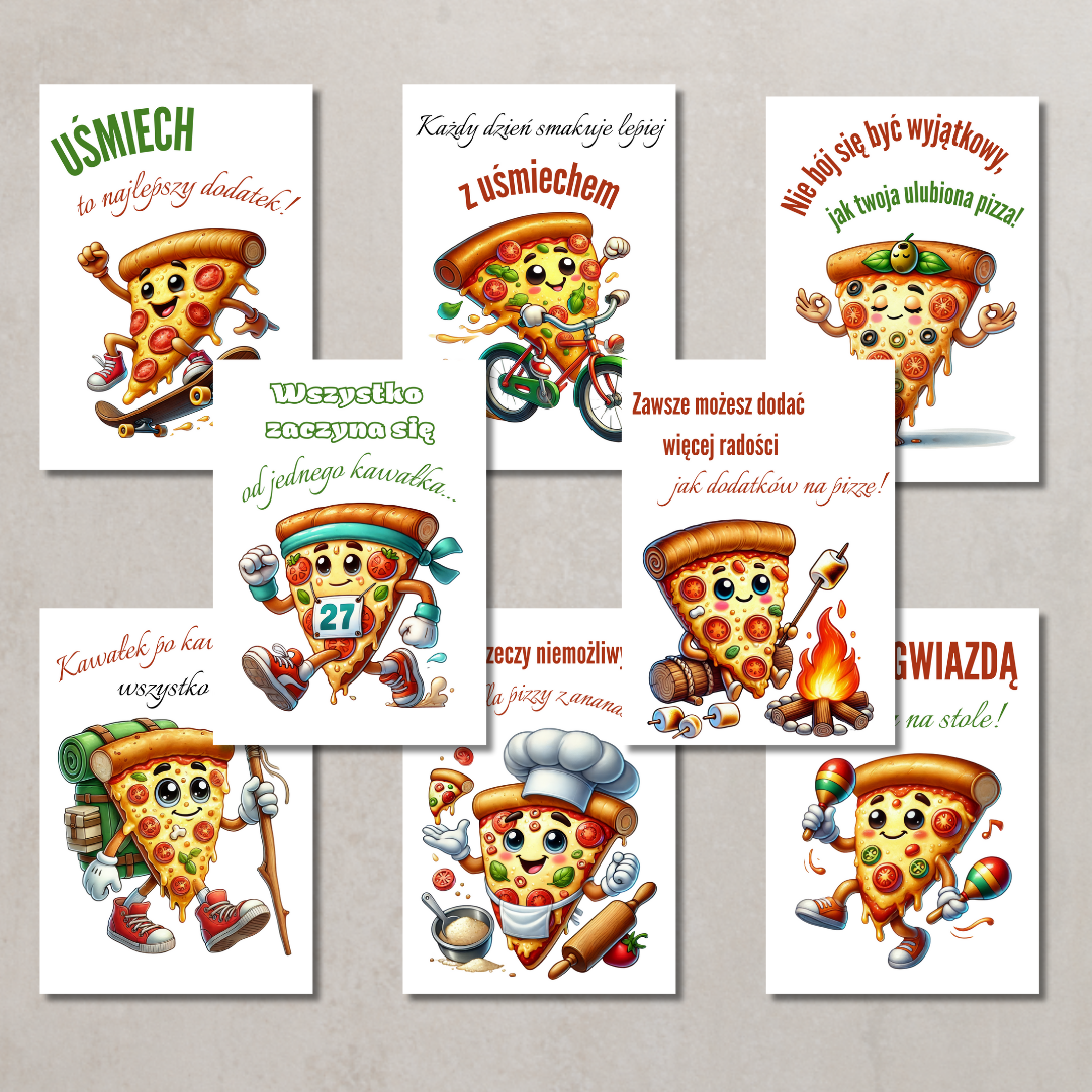 • Plakaty motywacyjne – wesołe ilustracje z kawałkami pizzy i pozytywnymi hasłami zachęcającymi do uśmiechu i radości.