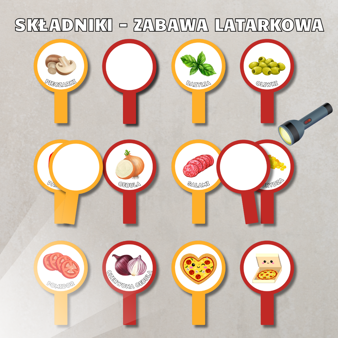 • Zabawa „Składniki – latarkowa” – angażująca gra edukacyjna rozwijająca spostrzegawczość i znajomość składników pizzy.