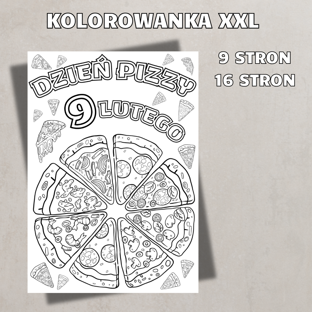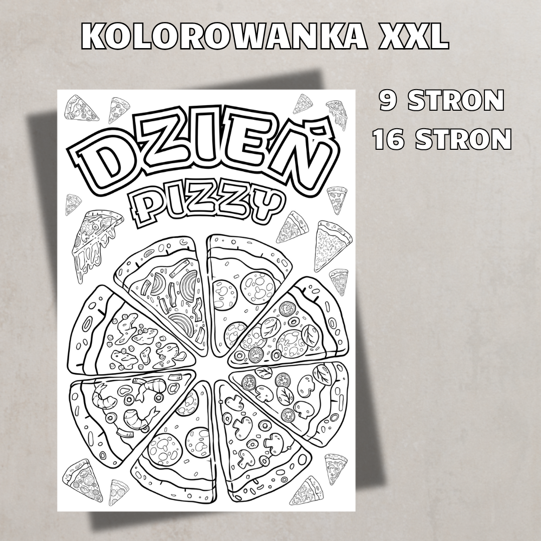 • Kolorowanki XXL (9 i 16 stron) – duże, szczegółowe obrazki do kolorowania w tematyce pizzy.
