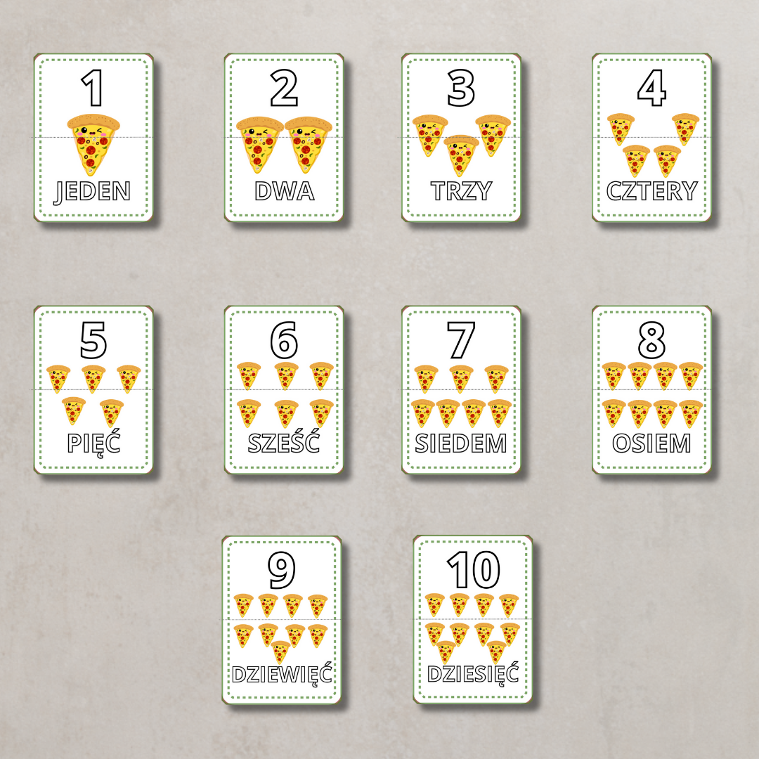 • Cyfry 1–10 – kolorowe karty z motywem pizzy do nauki i utrwalania liczb.