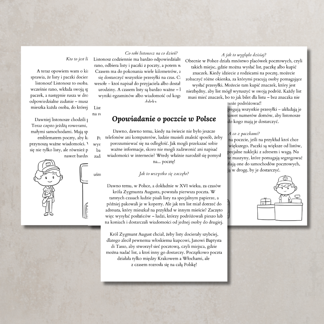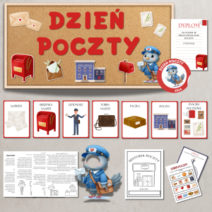 Kompletny zestaw materiałów do zorganizowania wyjątkowych zajęć tematycznych z okazji Dnia Poczty Polskiej (18 października) lub zajęć o zawodach, komunikacji i przesyłkach. Pakiet łączy edukację, zabawę i kreatywne działania, a jego estetyczne elementy pozwolą stworzyć piękną, tematyczną dekorację sali.