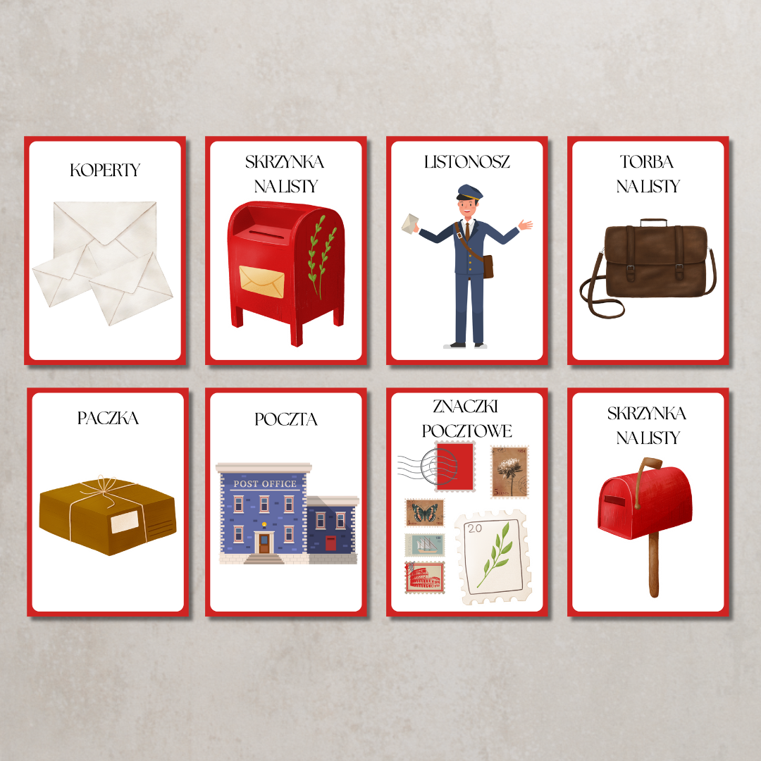 • Karty edukacyjne – pokazowe – ilustracje przedstawiające pracę poczty, listonosza, skrzynkę, znaczki i przesyłki.