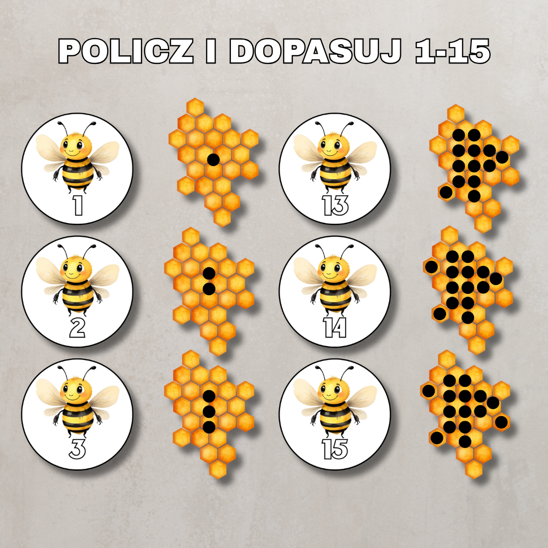 7. Karty matematyczne „Policz i dopasuj 1–15” Zadania z pszczółkami i plastrami miodu rozwijające umiejętność liczenia i dopasowywania ilości do liczby. 8. Karty pracy – matematyka Ćwiczenia liczbowe, przeliczanie elementów, porównywanie ilości, rozwiązywanie prostych działań.