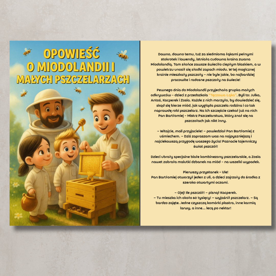 4. Opowieść edukacyjna „O Miodolandii i Małych Pszczelarzach” Ilustrowana historia, która w prosty i ciekawy sposób tłumaczy dzieciom, jak wygląda życie pszczół, jak powstaje miód i dlaczego warto dbać o te pożyteczne owady.
