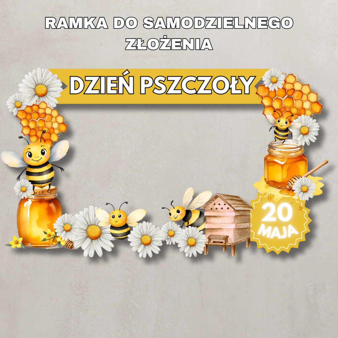 2. Dekoracje na tablicę i ramkę fotograficzną – pszczółki, słoiczki miodu, plastry, kwiaty i ul. W komplecie znajduje się ramka do samodzielnego złożenia z napisem „Dzień Pszczoły – 20 maja”, doskonała do zdjęć grupowych lub wystroju sali.