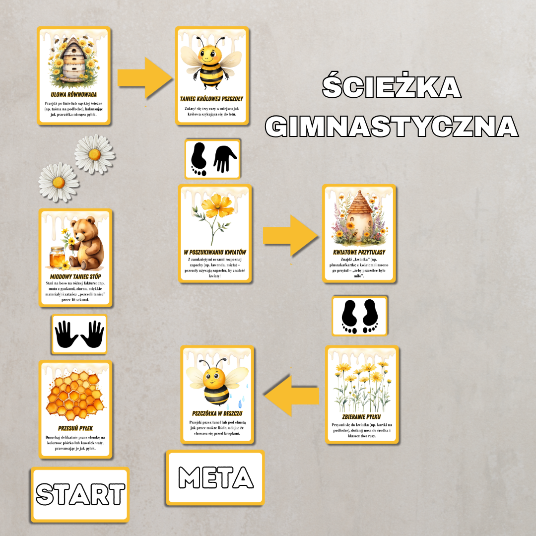 6. Ścieżka gimnastyczna „Pszczela wyprawa” Zestaw kart ruchowych i zadań – dzieci wcielają się w rolę pszczółek, wykonując różne aktywności (np. „Zbieranie pyłku”, „Przesuń pyłek”, „Taniec królowej pszczoły”). Doskonała forma aktywnej zabawy i ruchu.