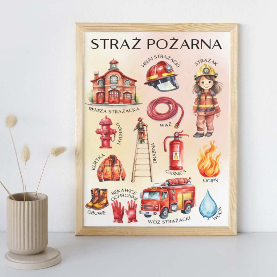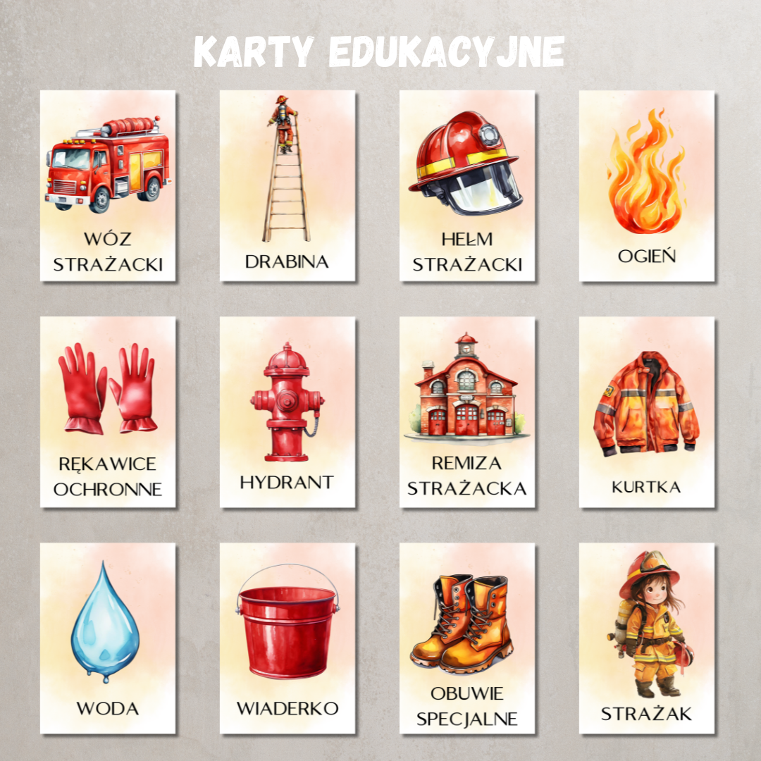 • Plansze edukacyjne i karty pracy – materiały wprowadzające temat pracy strażaka, zasad bezpieczeństwa oraz sposobów reagowania w razie pożaru.