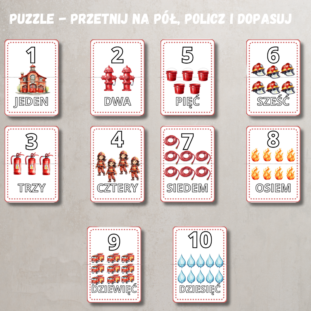 • Puzzle „Policz i dopasuj” – zadanie matematyczno-obserwacyjne z motywem strażackim.