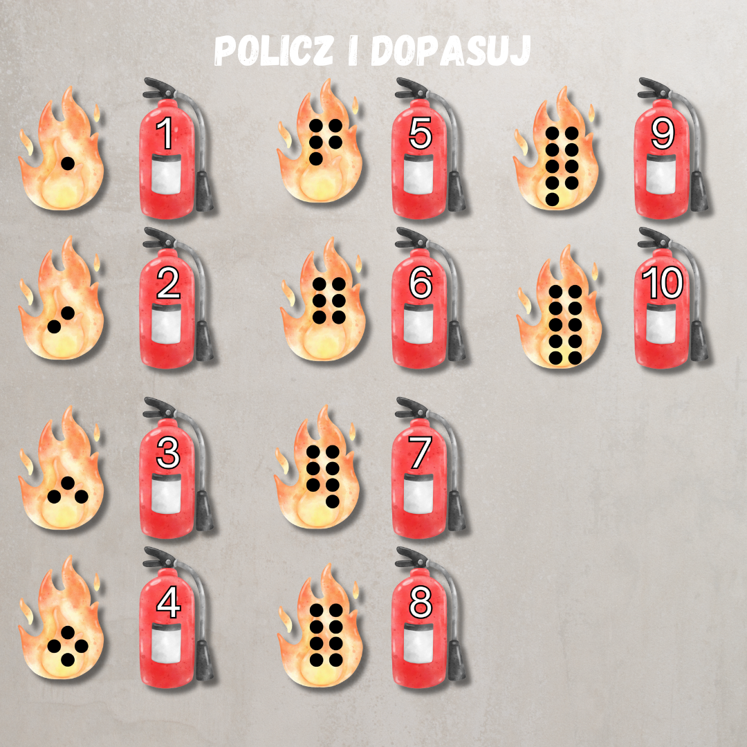• Zabawy dydaktyczne „Dopasuj gaśnicę do ognia 1–10” – ćwiczenia matematyczne utrwalające liczenie.