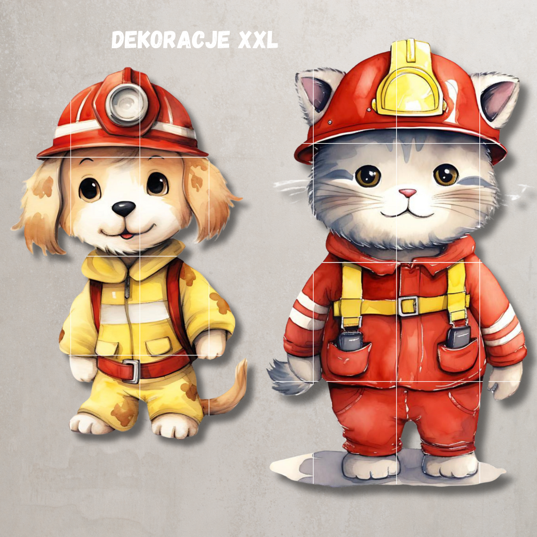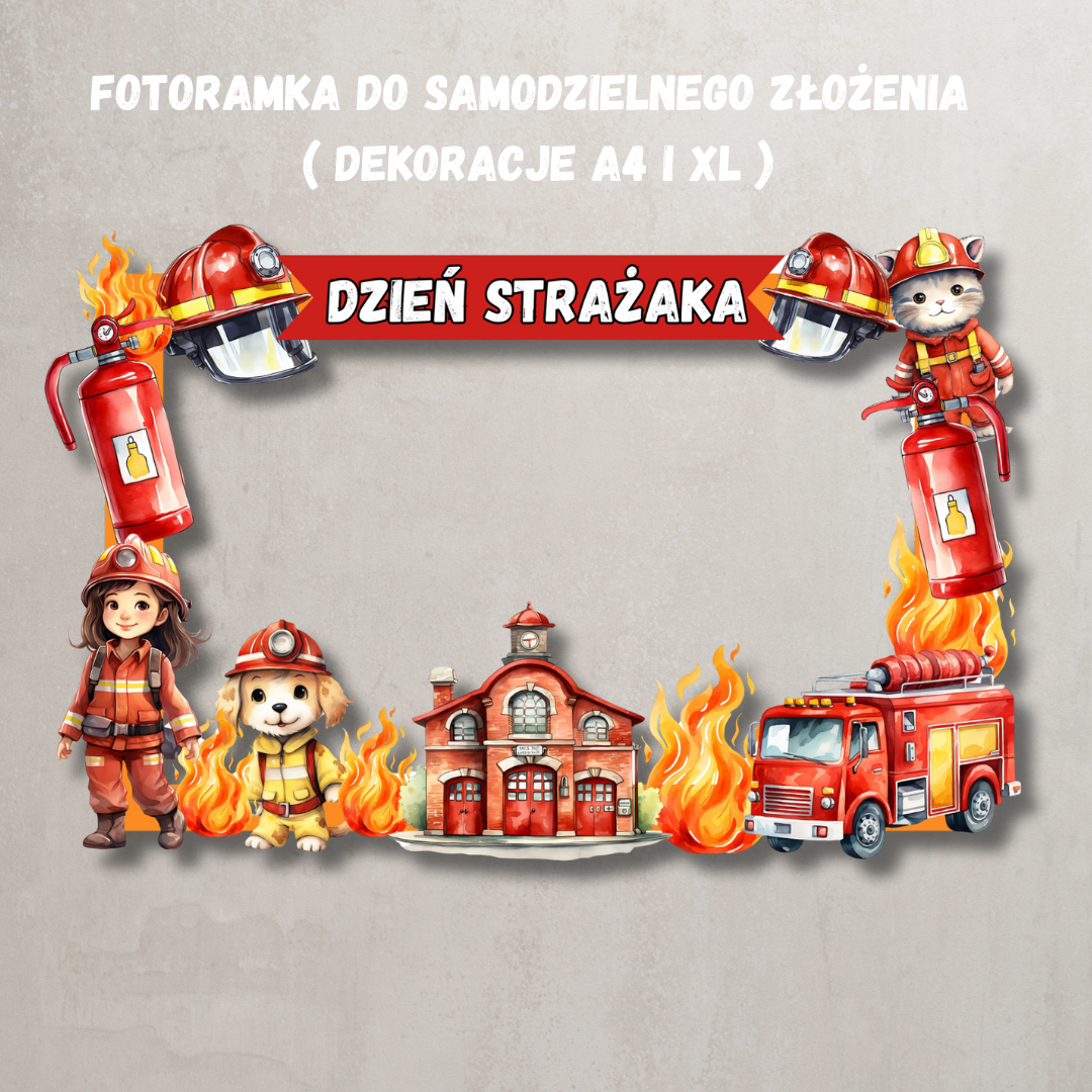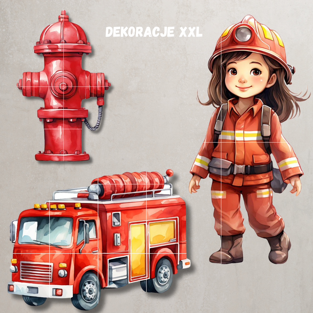 • Dekoracje XXL i A4 – zestaw dużych, barwnych ilustracji strażaków, pojazdów i akcesoriów gaśniczych.