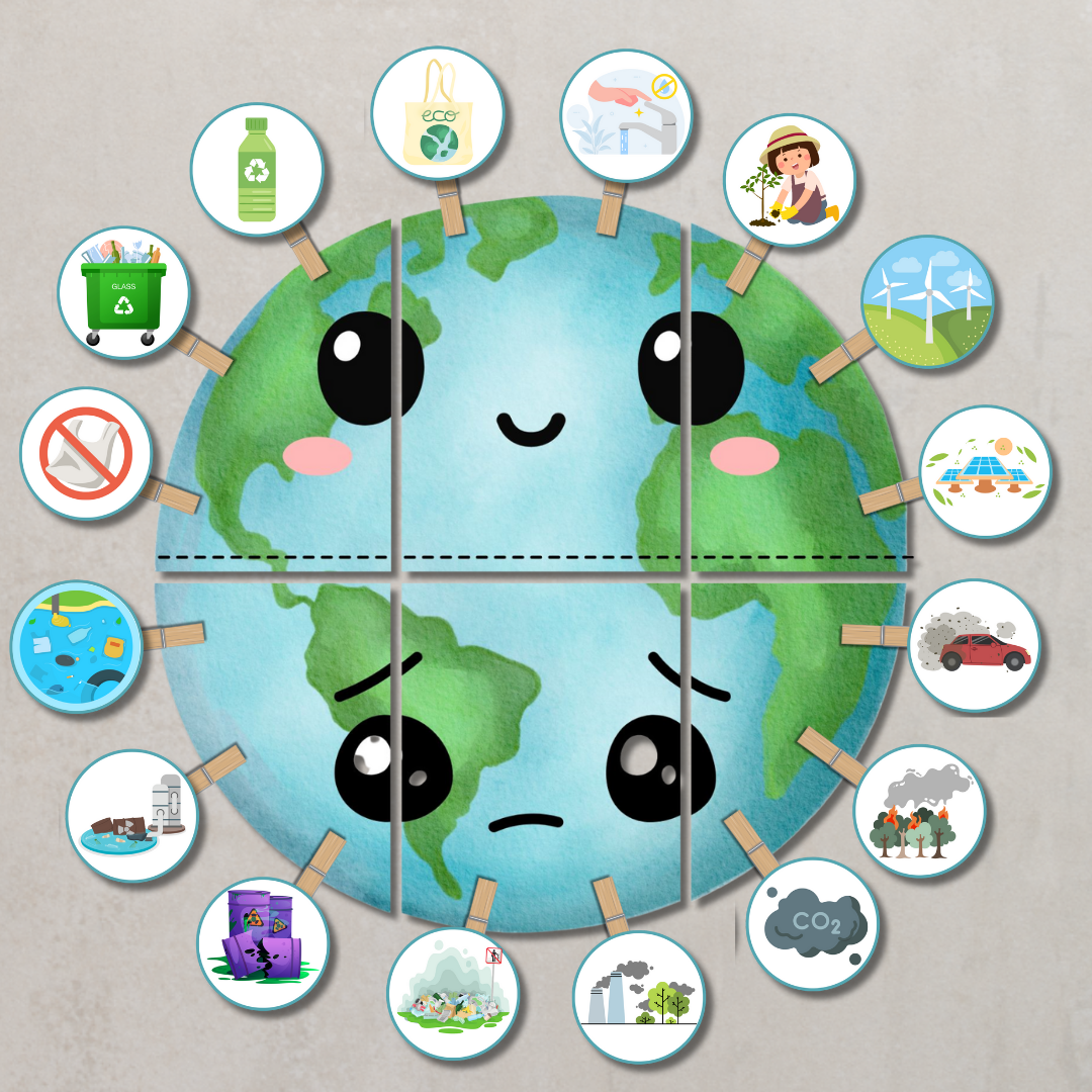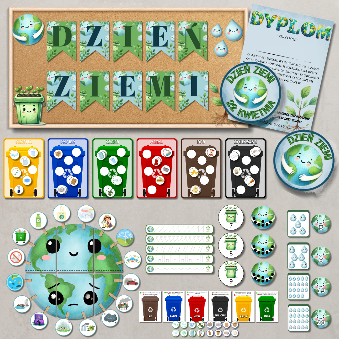 Gotowy do wydruku zestaw materiałów edukacyjnych do obchodów Dnia Ziemi (22 kwietnia) w przedszkolu lub szkole. Zestaw pomaga dzieciom zrozumieć, jak dbać o naszą planetę, uczy zasad segregacji śmieci oraz rozwija postawy proekologiczne w ciekawy i przystępny sposób.