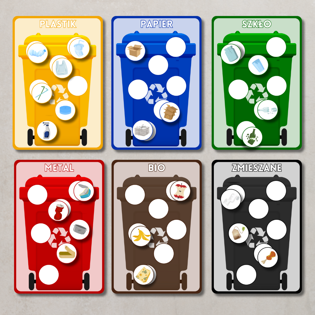 • Plansze edukacyjne do segregacji śmieci – plastik, papier, szkło, metal, bio i odpady zmieszane