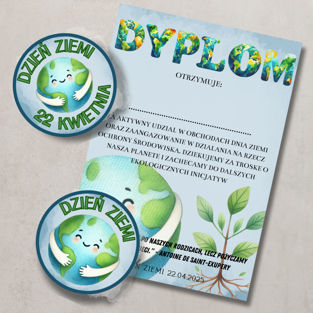 • Dyplom dla uczestników – za aktywny udział w obchodach Dnia Ziemi • Odznaki „DZIEŃ ZIEMI” – do przypięcia lub jako medale dla dzieci