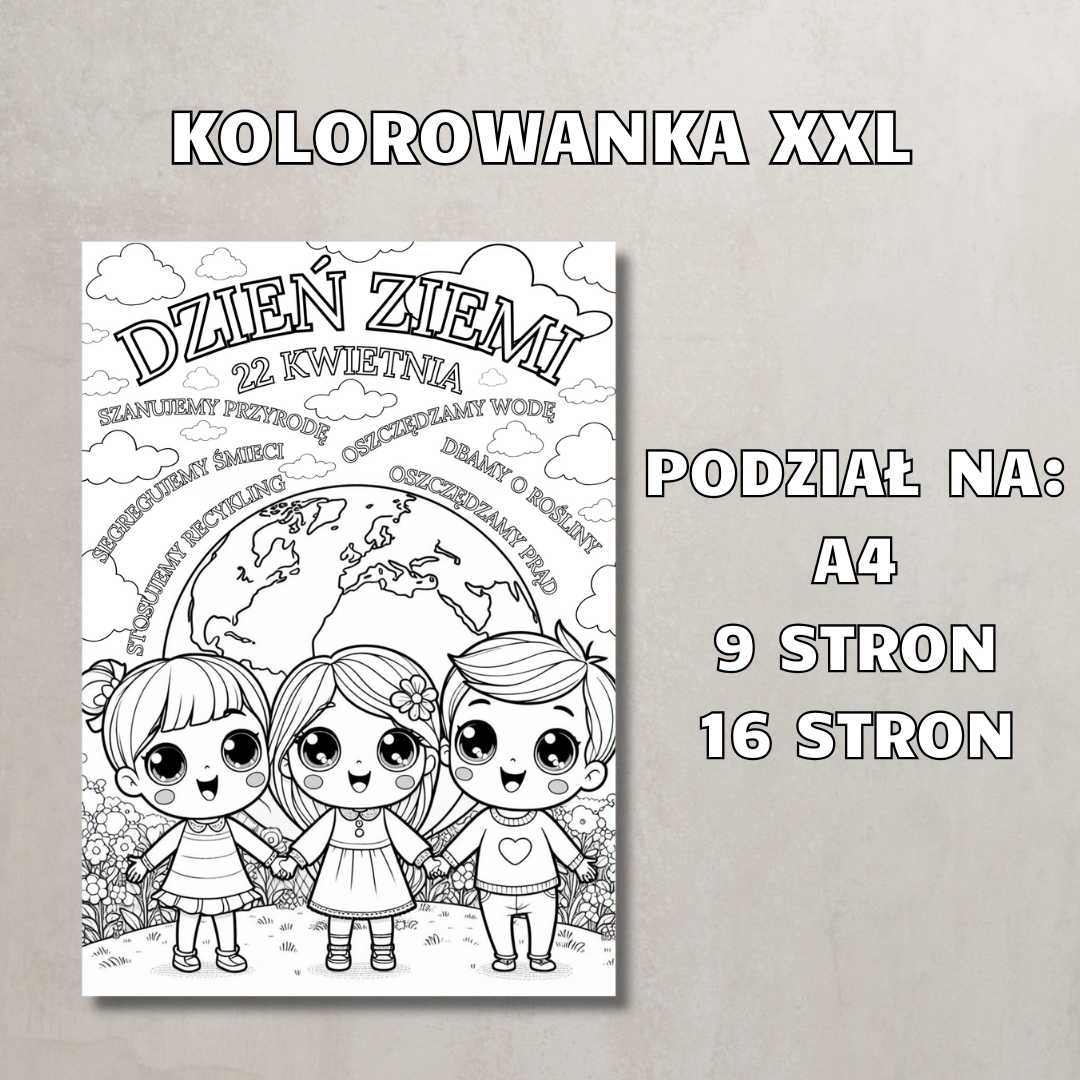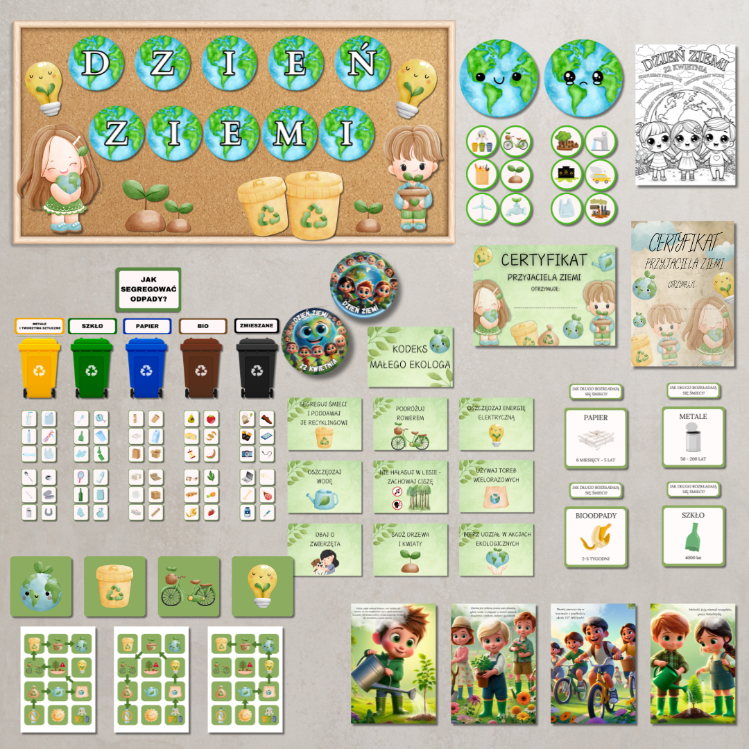Kompletny zestaw materiałów dydaktycznych i dekoracyjnych przygotowany z myślą o obchodach Dnia Ziemi (22 kwietnia) w przedszkolu, szkole lub świetlicy. Zestaw zawiera różnorodne pomoce do pracy z dziećmi – plakaty, gry, kolorowanki, karty pracy i dekoracje – wszystko w spójnej, przyjaznej szacie graficznej.