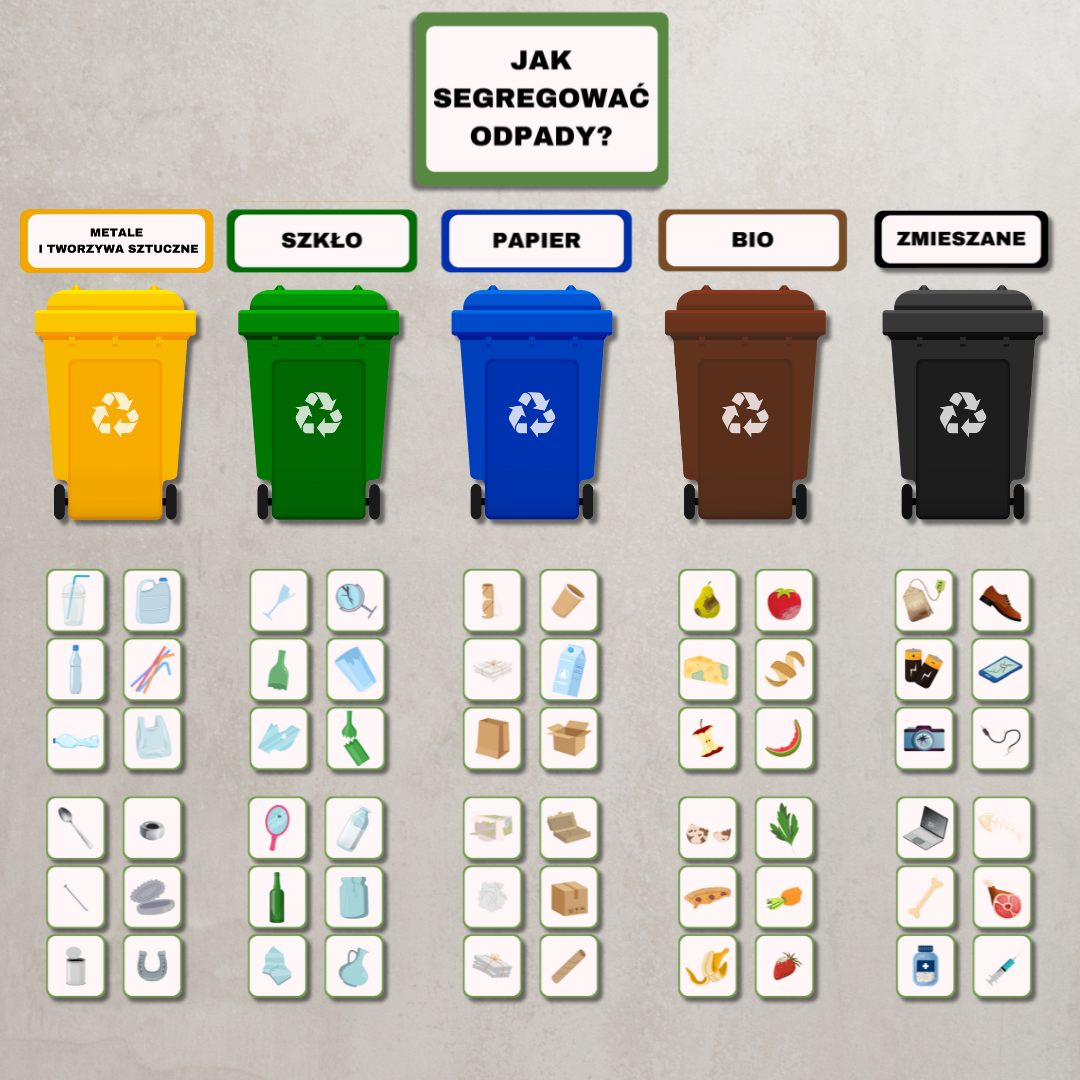 • Segregacja śmieci – zestaw kart i plansz do nauki segregowania odpadów.