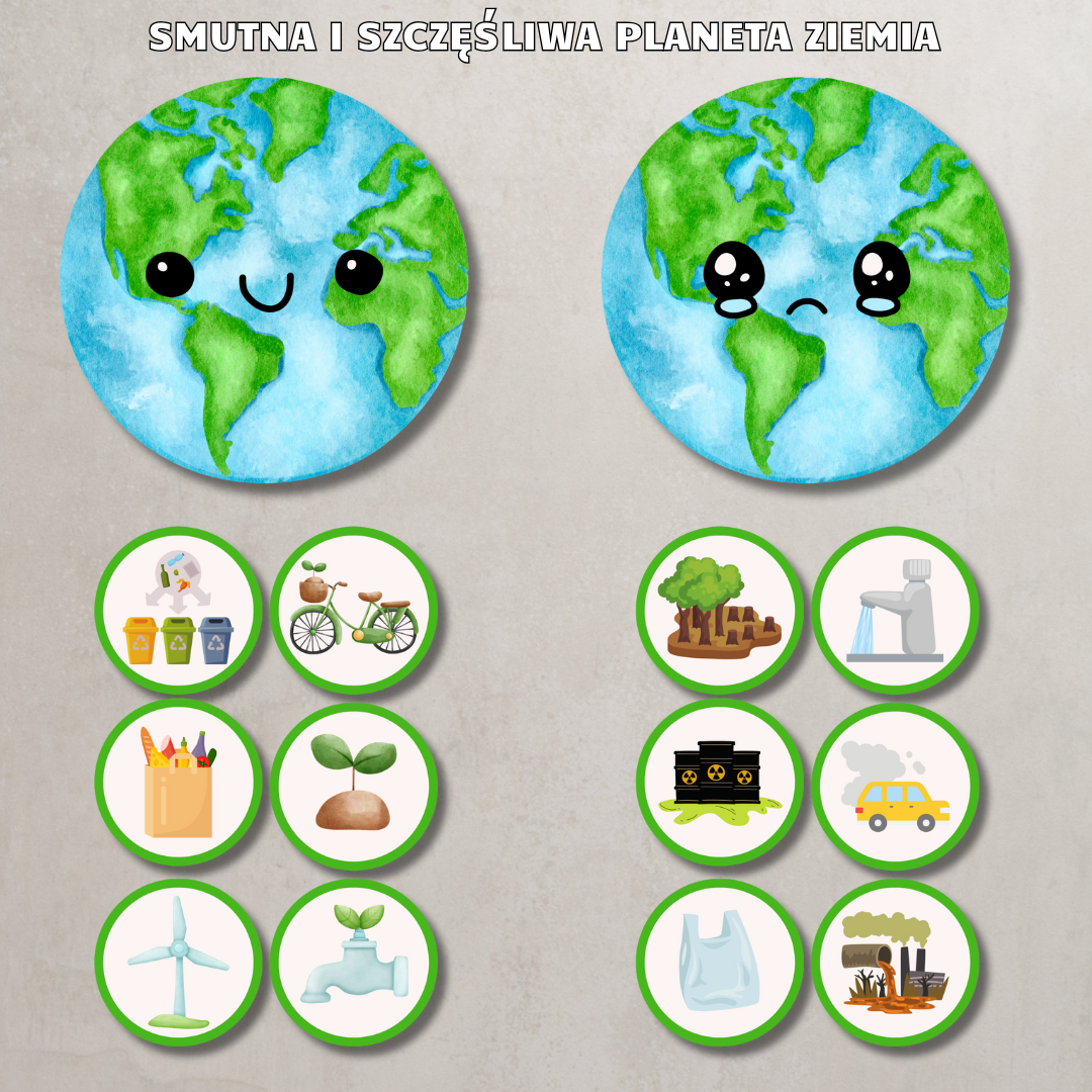 • Smutna i wesoła planeta – dopasuj – gra dydaktyczna ucząca właściwych zachowań ekologicznych.