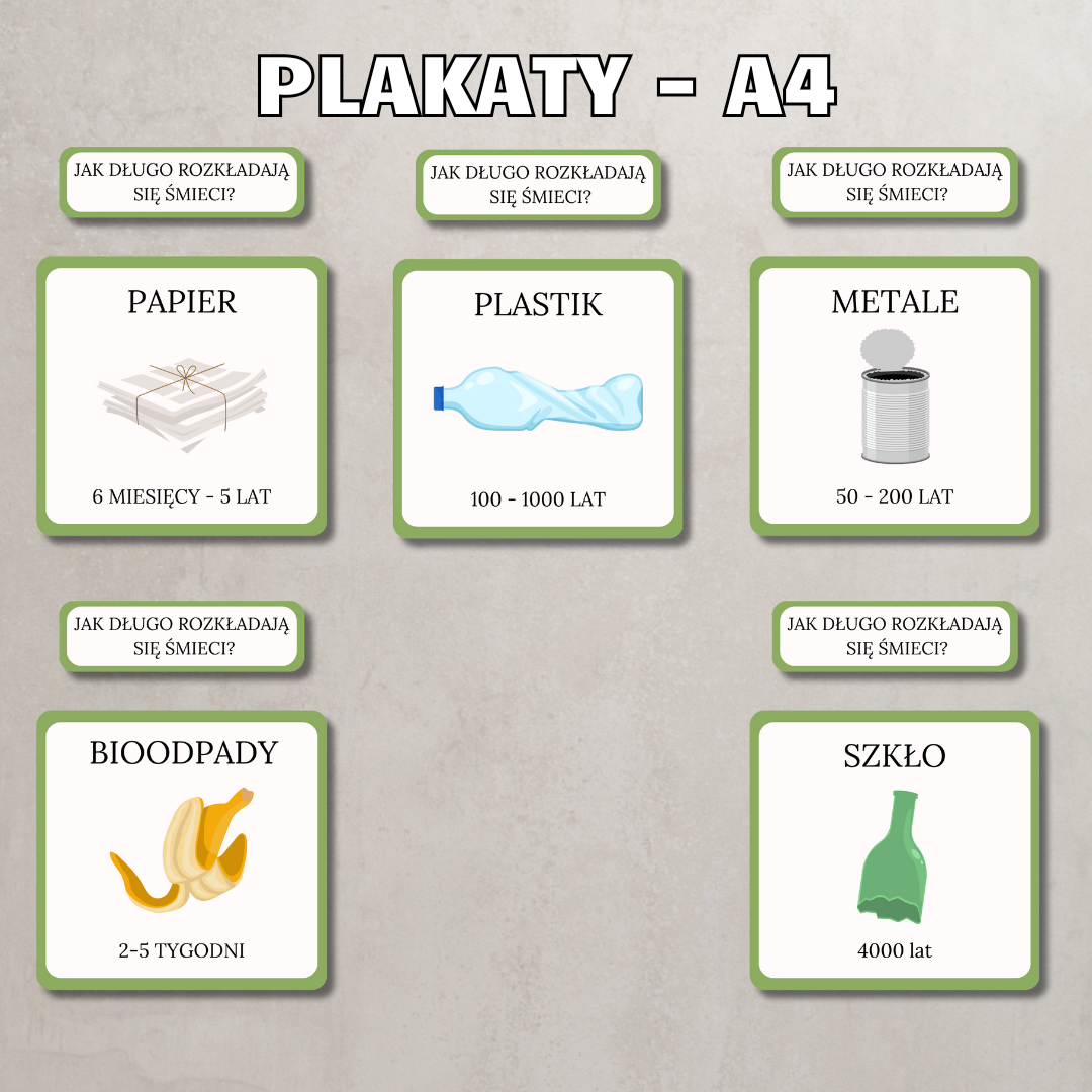 • Plakaty edukacyjne A4 – przedstawiające, jak długo rozkładają się różne rodzaje śmieci (papier, plastik, metal, szkło, bioodpady).