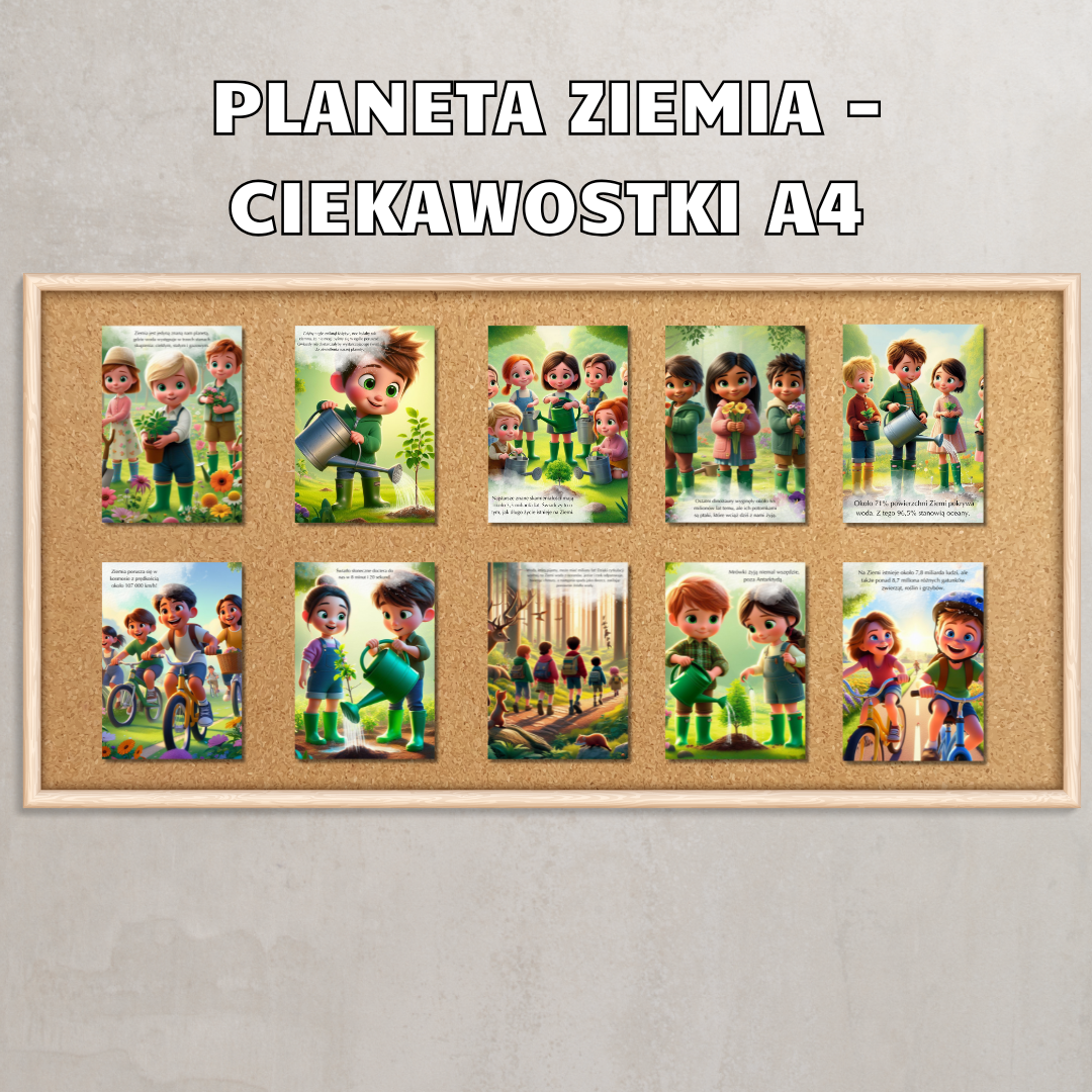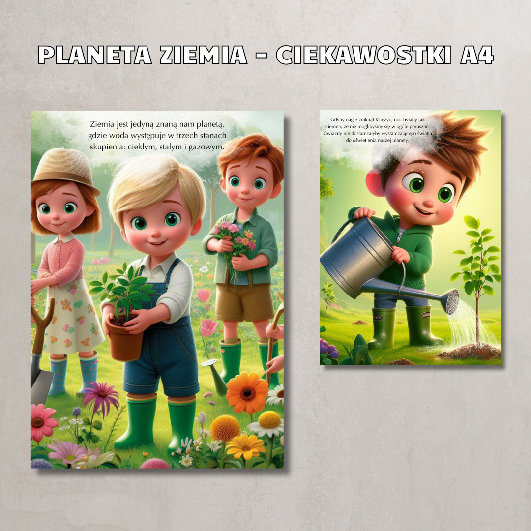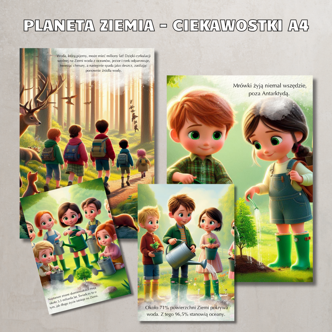 • Plakaty i plansze „Ciekawostki o planecie Ziemi” – kolorowe karty informacyjne z prostymi faktami przyrodniczymi.
