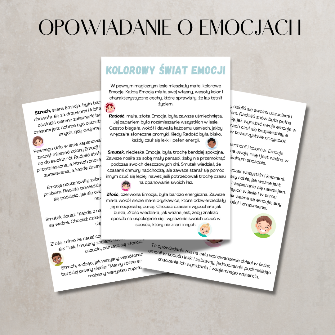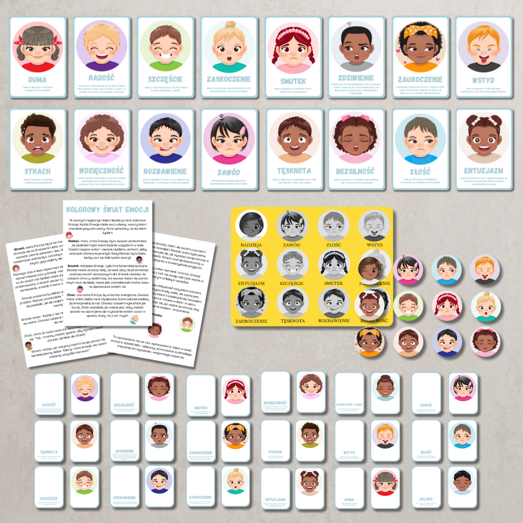 Pakiet Kolorowy Świat Emocji to zestaw edukacyjny wspierający rozwój emocjonalny dzieci. Pomaga rozpoznawać, nazywać i rozumieć emocje w przystępny i angażujący sposób.