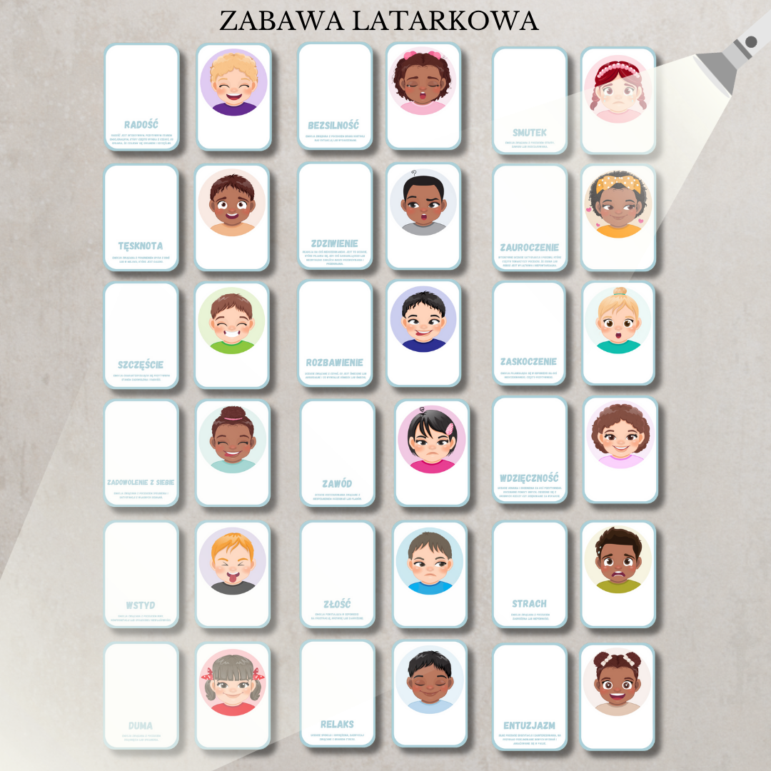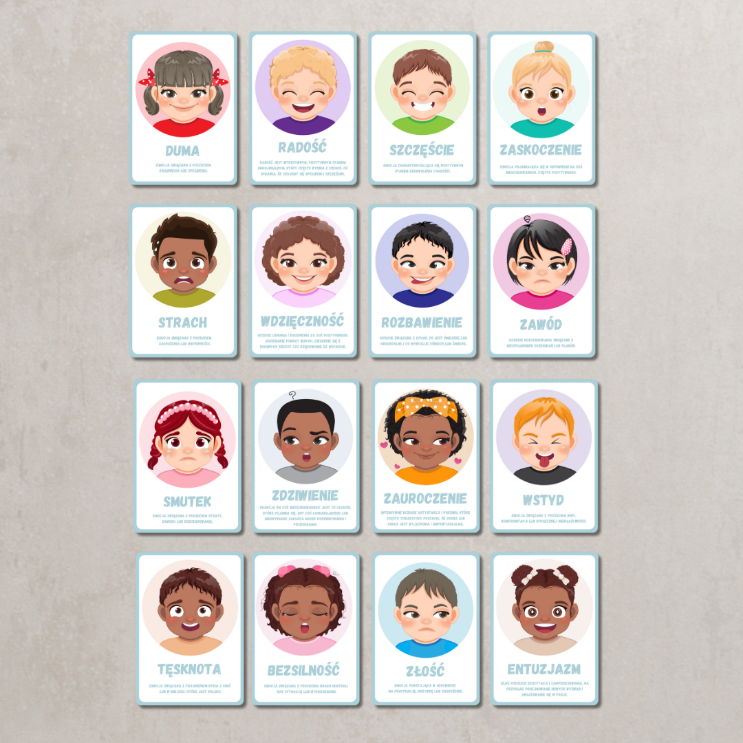 • 16 kart emocji z ilustracjami i opisami (m.in. radość, smutek, złość, strach, duma, szczęście, zdziwienie, wstyd, tęsknota, bezsilność, wdzięczność, entuzjazm),