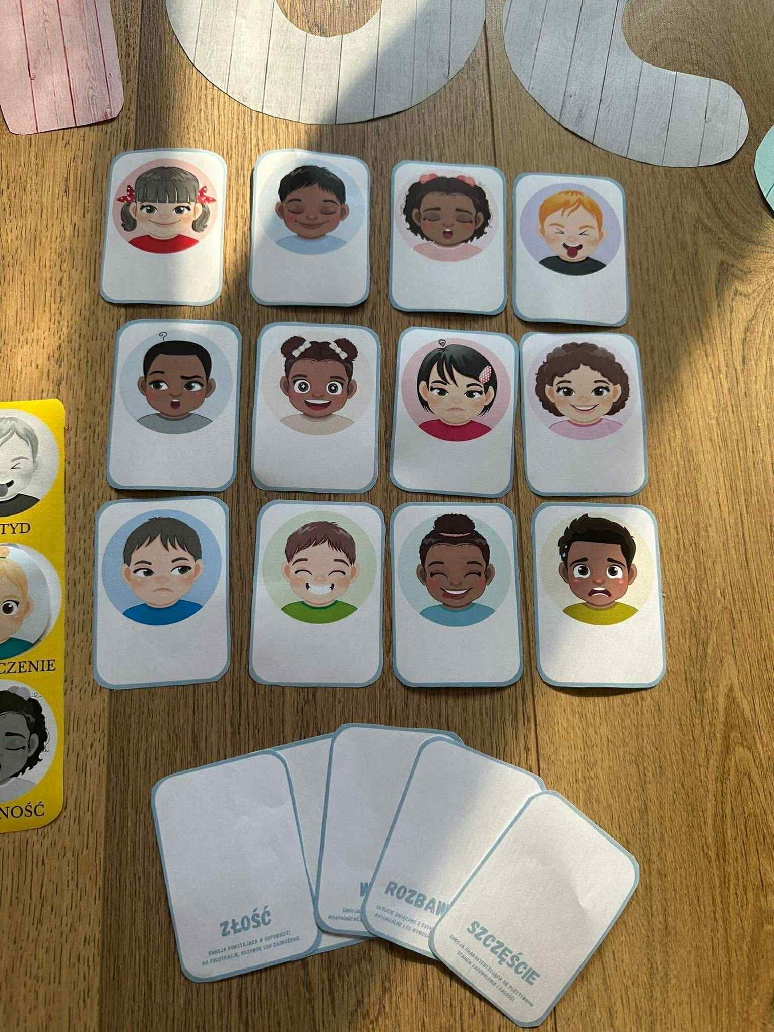 • karty i żetony z twarzami emocji – do gier i zabaw grupowych,