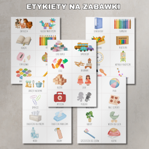 • Etykiety na pudełka z zabawkami i pomocami (np. klocki, puzzle, instrumenty, lalki, samochody, gry planszowe, artykuły plastyczne),