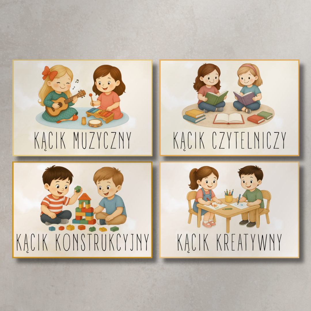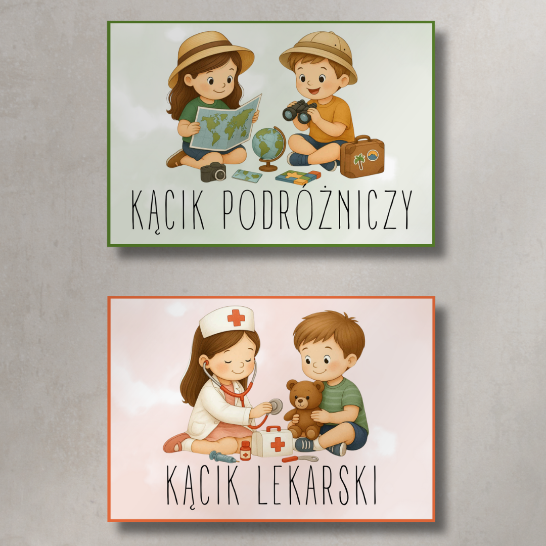 • Tabliczki do kącików tematycznych – m.in. kącik muzyczny, lekarski, podróżniczy, konstrukcyjny, czytelniczy, kreatywny.