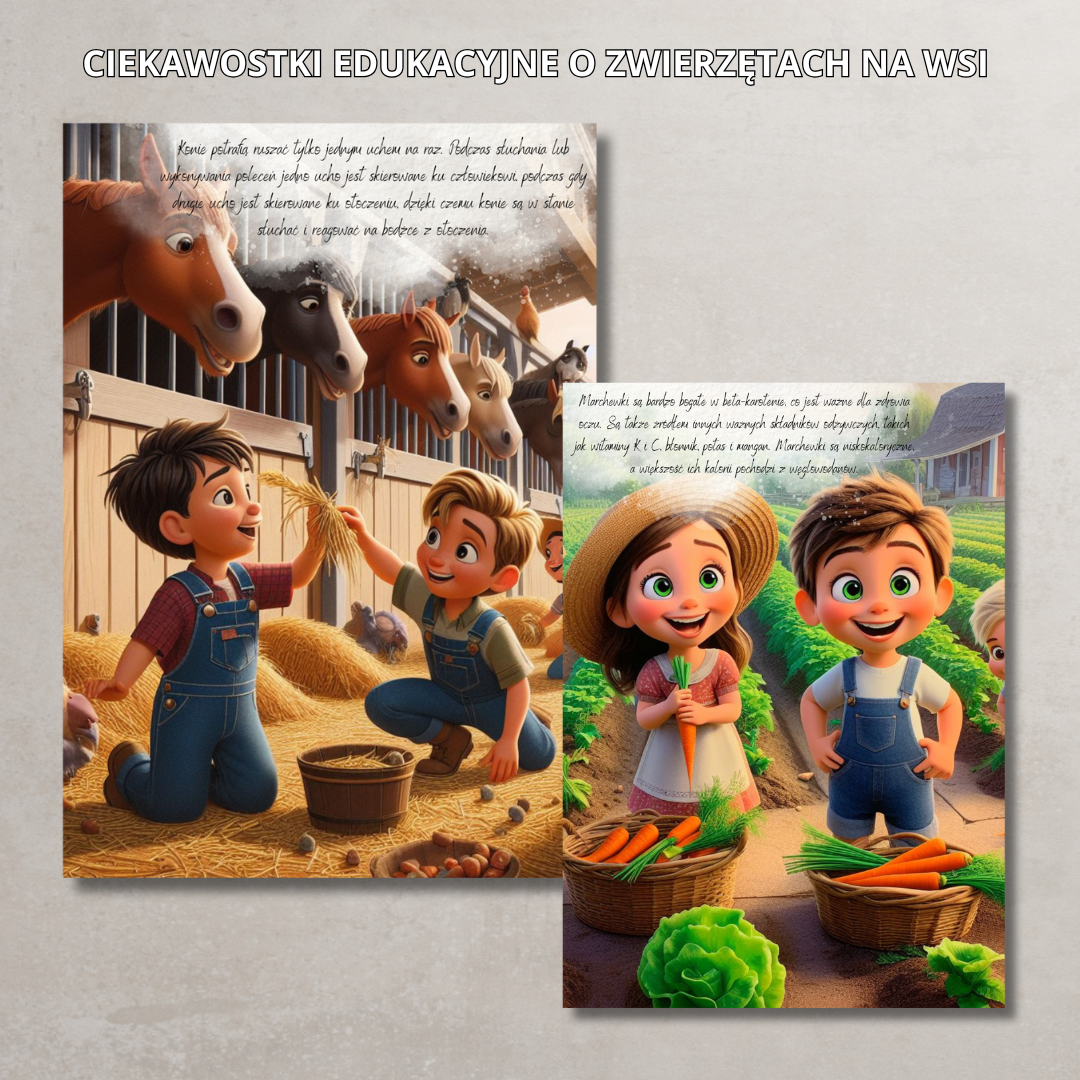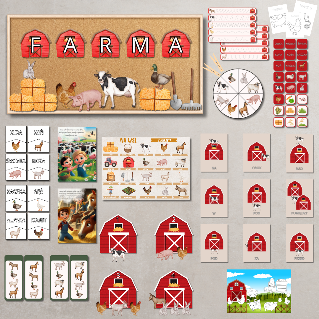Bogaty pakiet materiałów dydaktycznych, który w ciekawy i angażujący sposób wprowadza dzieci w temat życia na wsi. Zestaw łączy naukę z zabawą, rozwija słownictwo, umiejętność logicznego myślenia, przeliczania, a także ćwiczy motorykę małą i spostrzegawczość. Idealny do pracy z dziećmi w wieku przedszkolnym i wczesnoszkolnym.