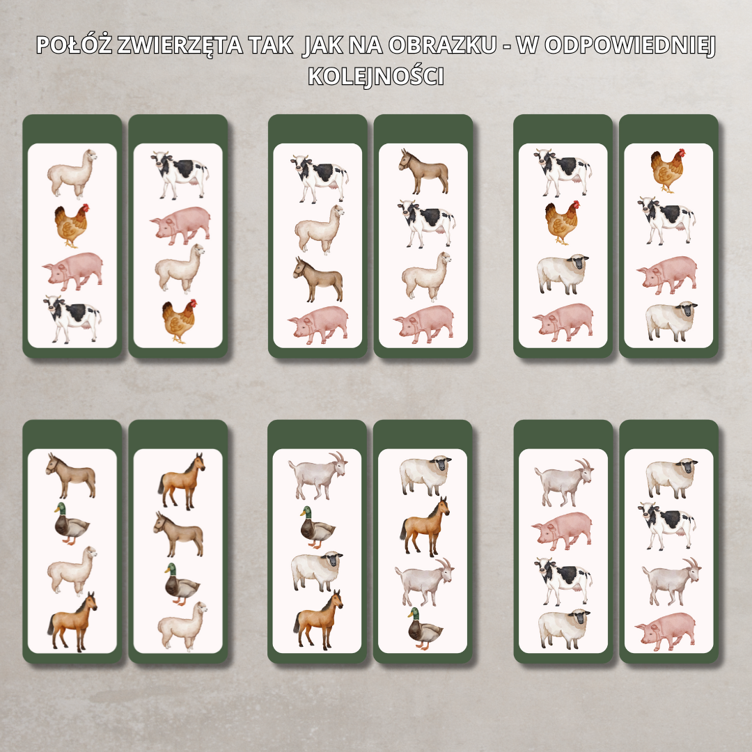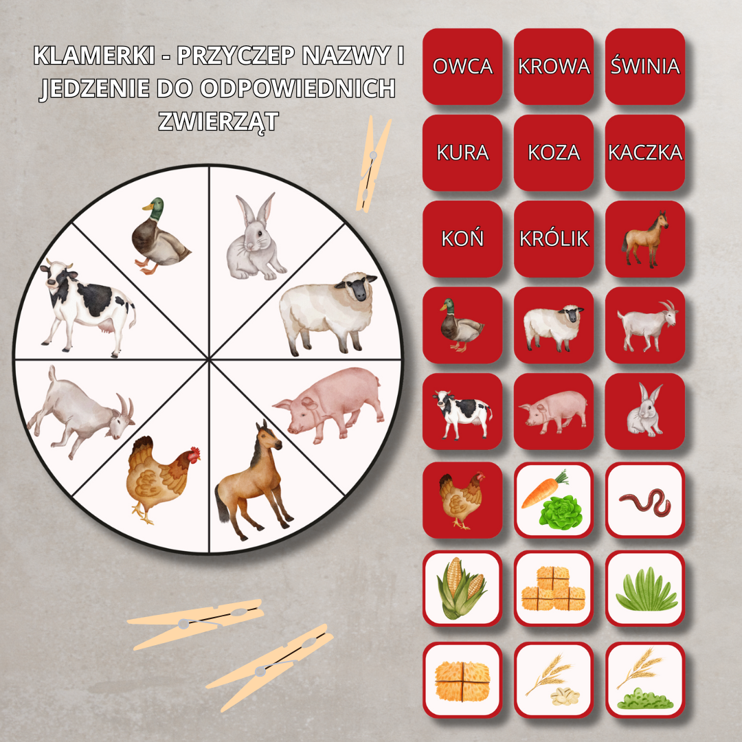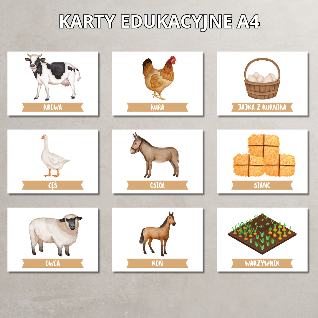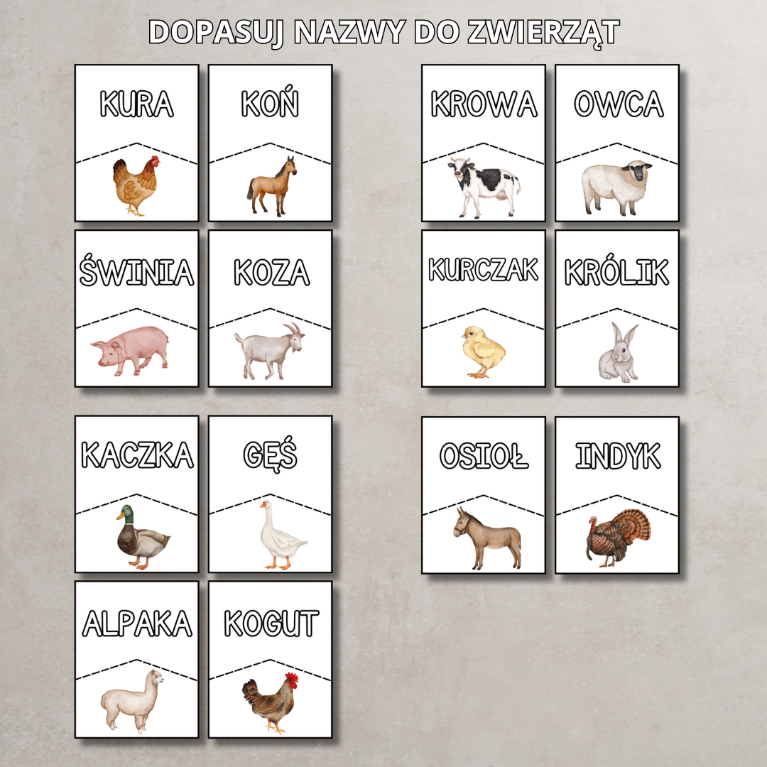 • Karty edukacyjne A4 z nazwami i ilustracjami zwierząt.