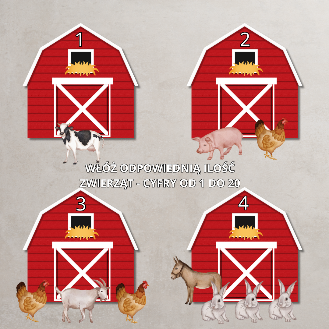 • „Ułóż zwierzęta na farmie” – dopasowywanie zwierząt do stodoły według liczby,