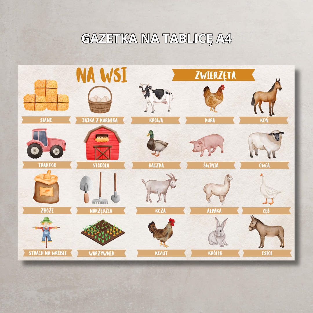 • Gazetka „Na wsi” – ilustracje i podpisy zwierząt, narzędzi i elementów wiejskiego krajobrazu,